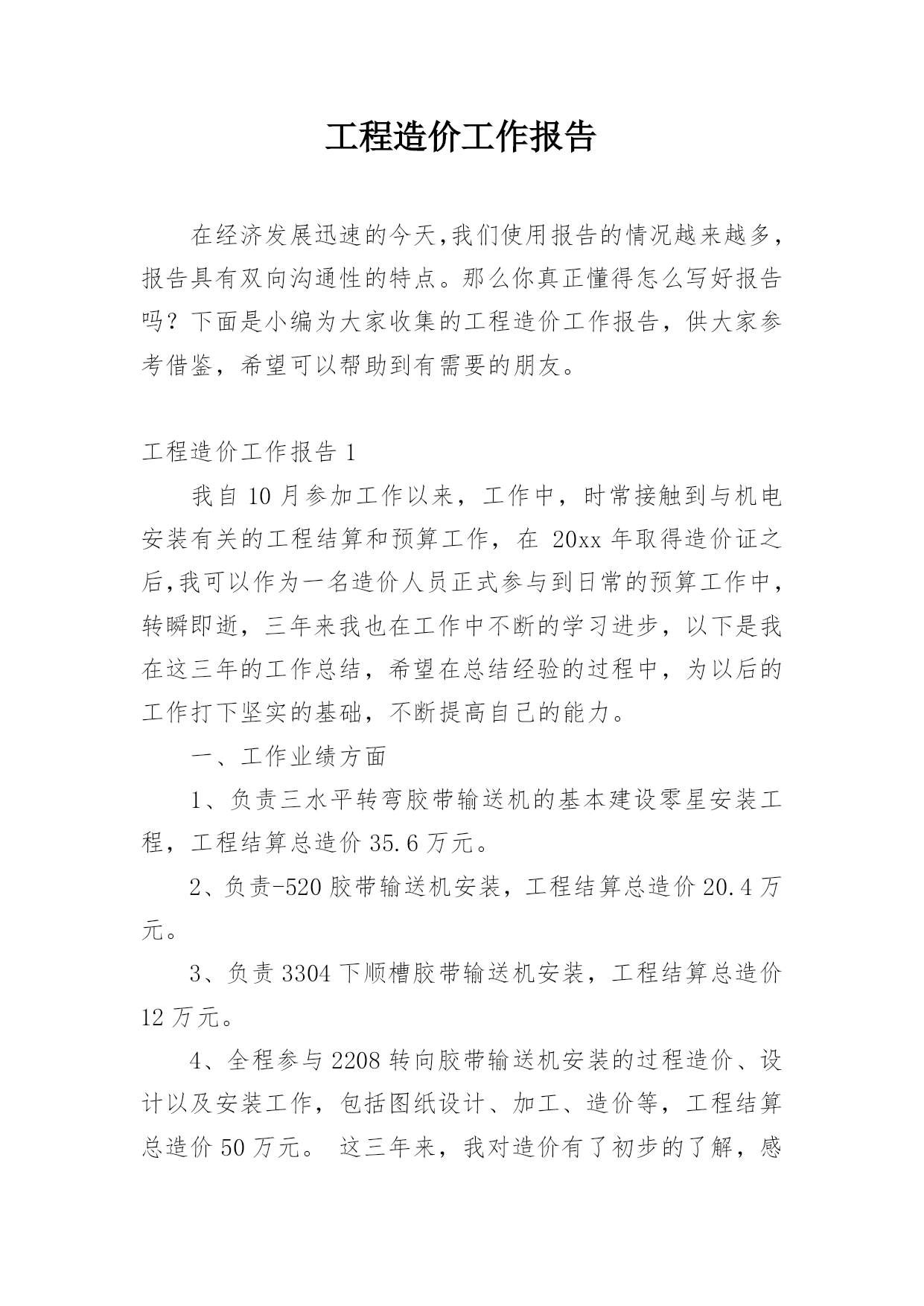工程造价工作报告在经济发展迅速的今天,我们使用报告的情况越来越多,报告具有双向沟通性的特点。那么你真正懂得怎么写好报告吗?下面是小编为大家收集的工程造价工作报告,供大家参考借鉴,希望可以帮助到有需要的朋友。工程造价工作报告1我自10月参加工作以来,工作中,时常接触到与机电安装有关的工程结算和预算工作,在20xx年取得造价证之后,我可以作为一名造价人员正式参与到日常的预算工作中,转瞬即逝,三年来我也在工作中不断的学习进步,以下是我在这三年的工作总结,希望在总结经验的过程中,为以后的工作打下坚实的基础,不断提