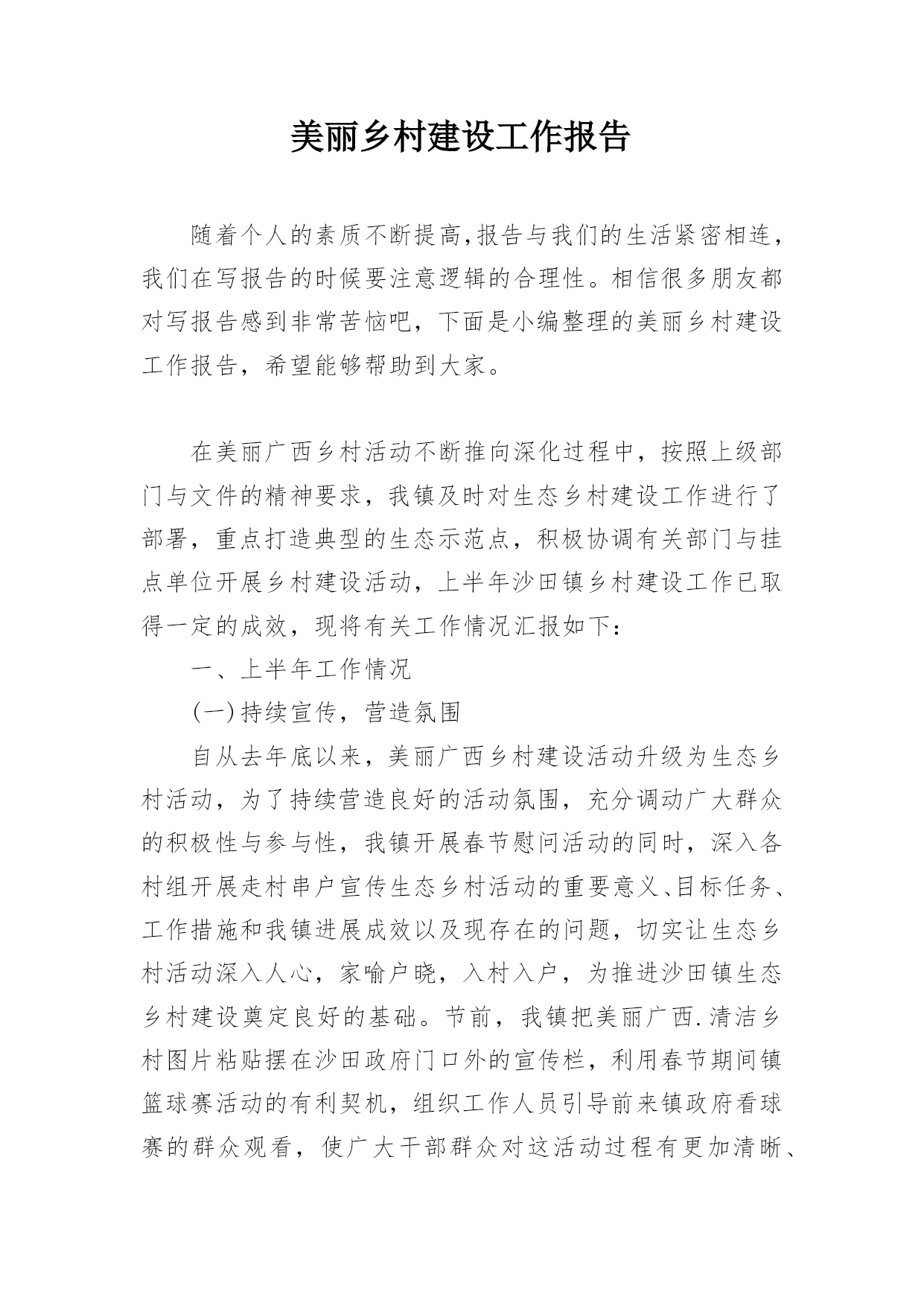 美丽乡村建设工作报告随着个人的素质不断提高,报告与我们的生活紧密相连,我们在写报告的时候要注意逻辑的合理性。相信很多朋友都对写报告感到非常苦恼吧,下面是小编整理的美丽乡村建设工作报告,希望能够帮助到大家。在美丽广西乡村活动不断推向深化过程中,按照上级部门与文件的精神要求,我镇及时对生态乡村建设工作进行了部署,重点打造典型的生态示范点,积极协调有关部门与挂点单位开展乡村建设活动,上半年沙田镇乡村建设工作已取得一定的成效,现将有关工作情况汇报如下:一、上半年工作情况(一)持续宣传,营造氛围自从去年底以来,美丽
