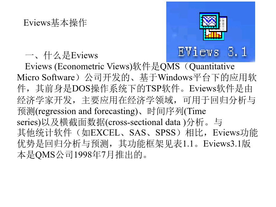 一、什么是EviewsEviews(EconometricViews)软件是QMS(QuantitativeMicroSoftware)公司开发的、基于Windows平台下的应用软件,其前身是DOS操作系统下的TSP软件。Eviews软件是由经济学家开发,主要应用在经济学领域,可用于回归分析与预测(regressionandforecasting)、时间序列(Timeseries)以及横截面数据(cross-sectionaldata)分析。与其他统计软件(如EXCEL、SAS、SPSS)相比,Eview