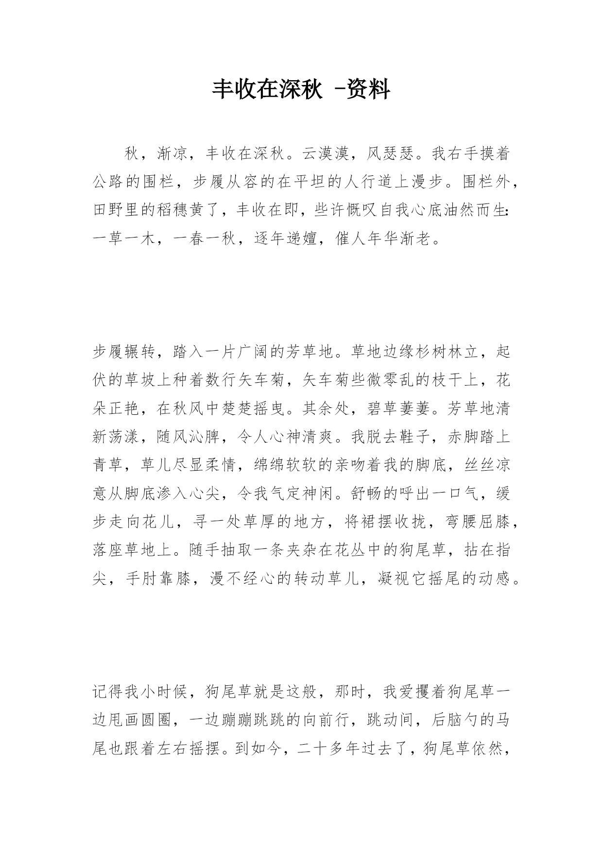 丰收在深秋-资料秋,渐凉,丰收在深秋。云漠漠,风瑟瑟。我右手摸着公路的围栏,步履从容的在平坦的人行道上漫步。围栏外,田野里的稻穗黄了,丰收在即,些许慨叹自我心底油然而生:一草一木,一春一秋,逐年递嬗,催人年华渐老。步履辗转,踏入一片广阔的芳草地。草地边缘杉树林立,起伏的草坡上种着数行矢车菊,矢车菊些微零乱的枝干上,花朵正艳,在秋风中楚楚摇曳。其余处,碧草萋萋。芳草地清新荡漾,随风沁脾,令人心神清爽。我脱去鞋子,赤脚踏上青草,草儿尽显柔情,绵绵软软的亲吻着我的脚底,丝丝凉意从脚底渗入心尖,令我气定神闲。舒畅