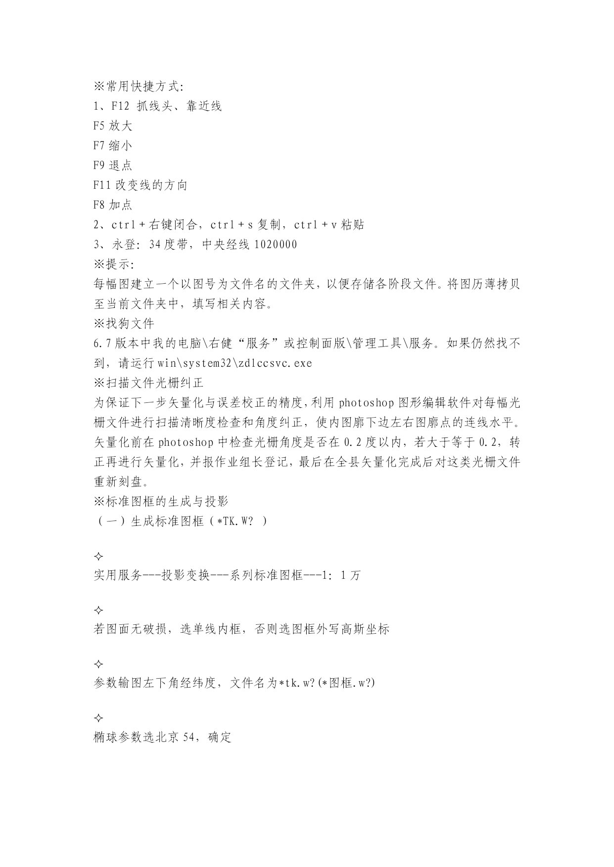 ※常用快捷方式:1、F12抓线头、靠近线F5放大F7缩小F9退点F11改变线的方向F8加点2、ctrl+右键闭合,ctrl+s复制,ctrl+v粘贴3、永登:34度带,中央经线1020000※提示:每幅图建立一个以图号为文件名的文件夹,以便存储各阶段文件。将图历薄拷贝至当前文件夹中,填写相关内容。※找狗文件6.7版本中我的电脑\右健“服务”或控制面版\管理工具\服务。如果仍然找不到,请运行win\system32\zdlccsvc.exe※扫描文件光栅纠正为保证下一步矢量化与误差校正的精度,利用photo