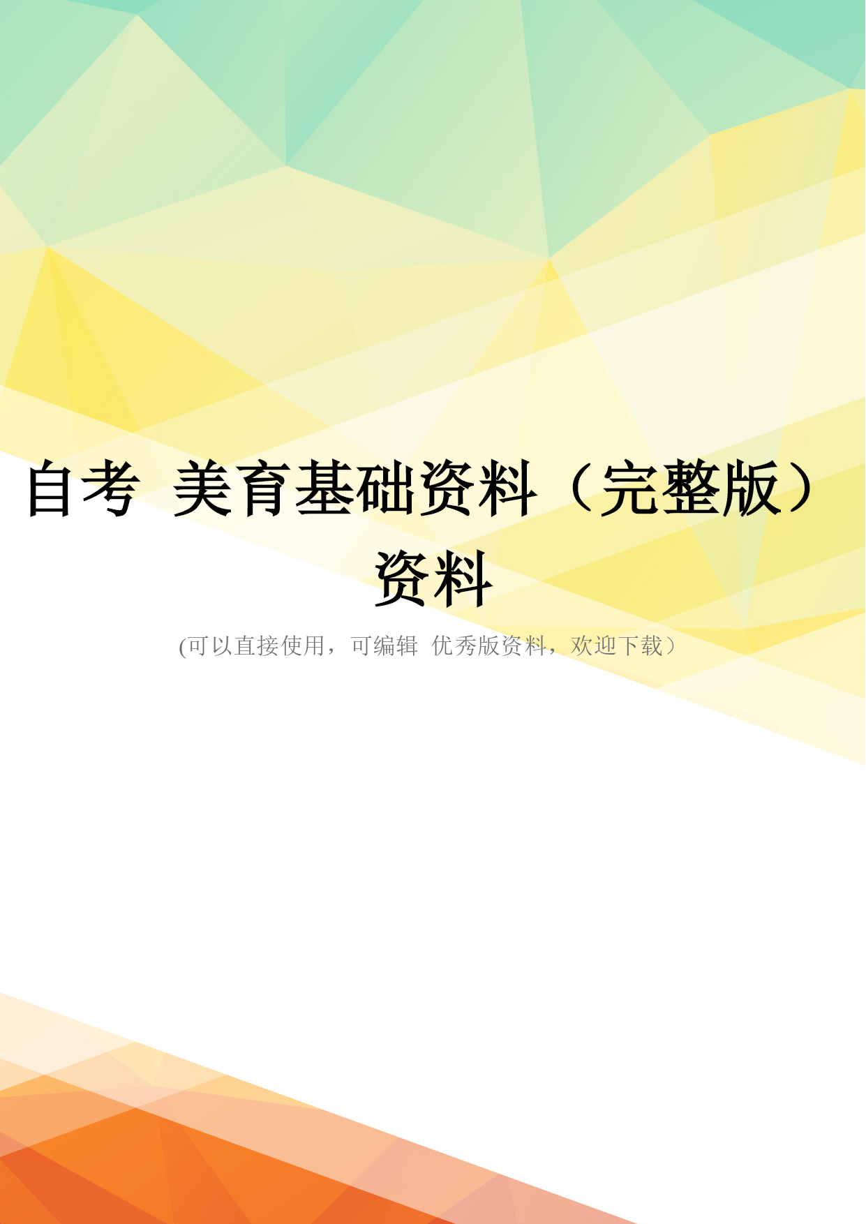 自考美育基础资料(完整版)资料(可以直接使用,可编辑优秀版资料,欢迎下载)绪论学习目的与要求通过本章的学习,明确美育学的性质和研究对象,了解美育发展的历史,认识美育对培养全面发展的人才以及社会主义建设事业和我们的现实生活的重要意义,以便从宏观上对美育这门学科有个概括的了解,为学习美育的具体内容打下基础。课程内容与考核要求识记美育学研究的对象、范围和基本内容,贺拉斯的“寓教于乐”,梁启超的“趣味教育”、蔡元培的“以美育代宗教”说。领会席勒的美育思想,孔子的美育思想,蔡元培的美育思想,美育与美学、教育学的关系