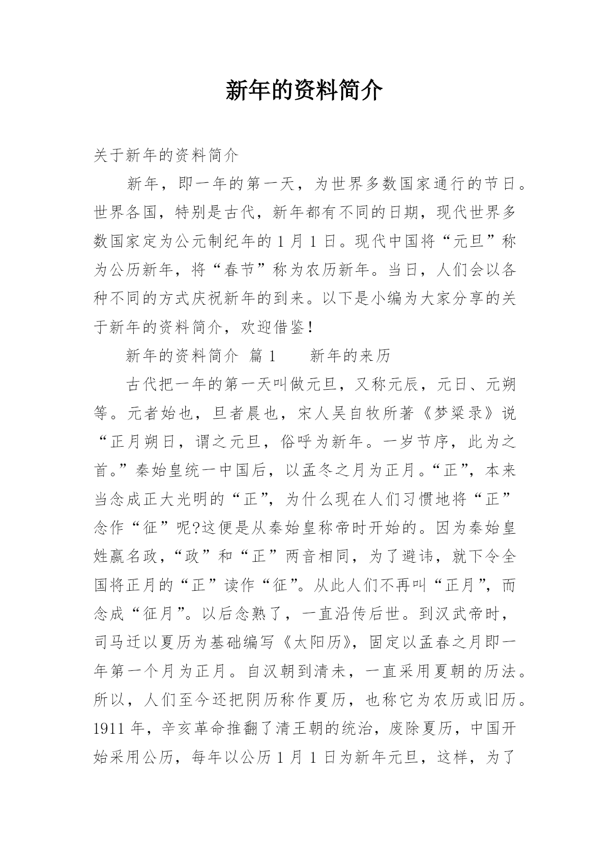 新年的资料简介关于新年的资料简介新年,即一年的第一天,为世界多数国家通行的节日。世界各国,特别是古代,新年都有不同的日期,现代世界多数国家定为公元制纪年的1月1日。现代中国将“元旦”称为公历新年,将“春节”称为农历新年。当日,人们会以各种不同的方式庆祝新年的到来。以下是小编为大家分享的关于新年的资料简介,欢迎借鉴!新年的资料简介篇1新年的来历古代把一年的第一天叫做元旦,又称元辰,元日、元朔等。元者始也,旦者晨也,宋人吴自牧所著《梦粱录》说“正月朔日,谓之元旦,俗呼为新年。一岁节序,此为之首。”秦始皇统一中