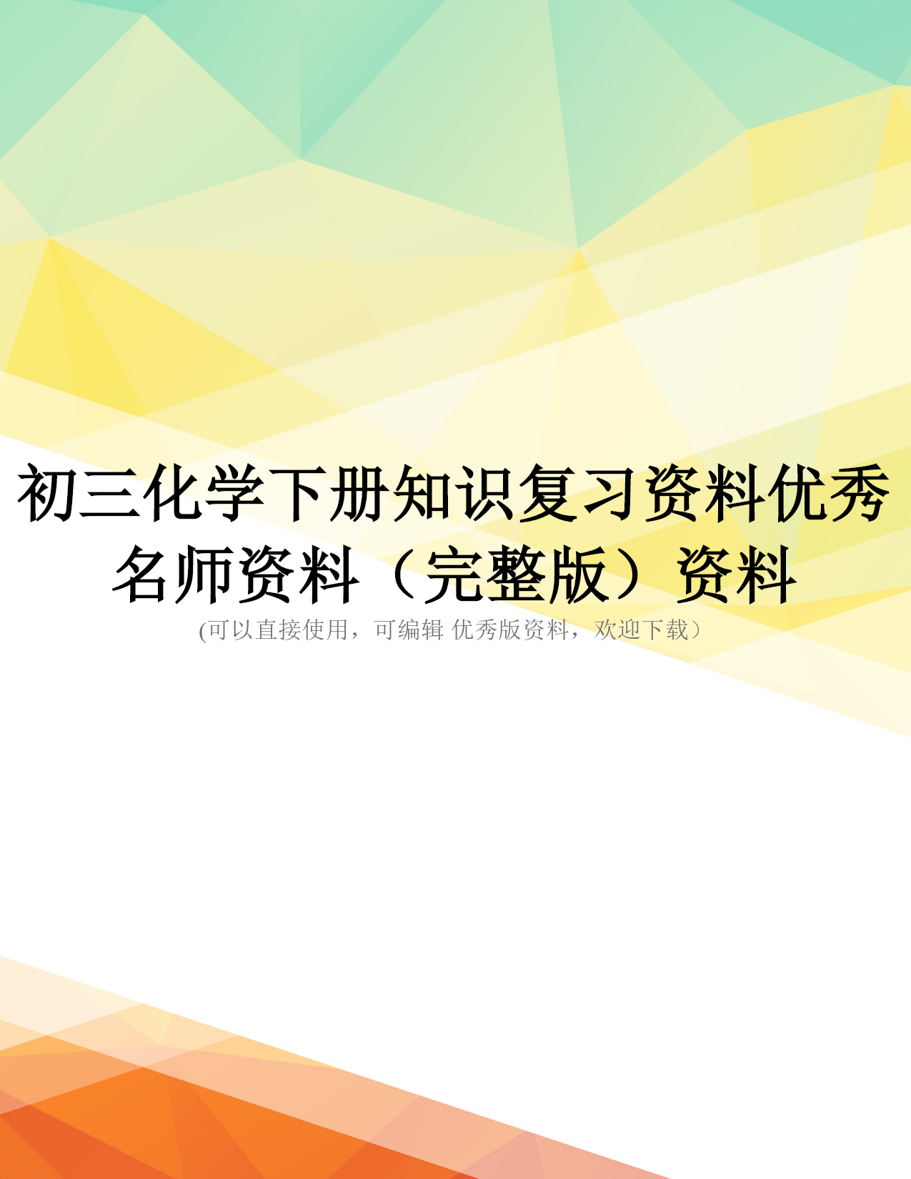 初三化学下册知识复习资料优秀名师资料(完整版)资料(可以直接使用,可编辑优秀版资料,欢迎下载)初三化学下册知识复习资料第八单元金属和金属材料一、金属的物理性质:具有金属光泽,大多数都是银白色(铜是紫红色,金是黄色);具有良好的延展性和导电、导热性能;在室温下都是固体(除汞外)。二、从性质决定用途的观点出发,列举金属的用途。了解常见金属的特性及用途;如:Cu、Fe、Al。Cu:具有良好的导电性和延展性,可制导线。Fe:具有较好的机械加工性能,可制机械用品。Al:表面易形成一层致密的氧化铝薄膜,从而阻止铝进一