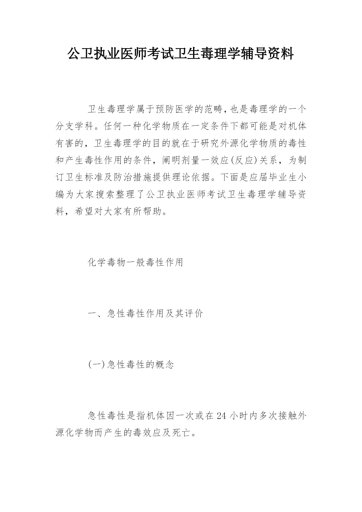 公卫执业医师考试卫生毒理学辅导资料卫生毒理学属于预防医学的范畴,也是毒理学的一个分支学科。任何一种化学物质在一定条件下都可能是对机体有害的,卫生毒理学的目的就在于研究外源化学物质的毒性和产生毒性作用的条件,阐明剂量一效应(反应)关系,为制订卫生标准及防治措施提供理论依据。下面是应届毕业生小编为大家搜索整理了公卫执业医师考试卫生毒理学辅导资料,希望对大家有所帮助。化学毒物一般毒性作用一、急性毒性作用及其评价(一)急性毒性的概念急性毒性是指机体因一次或在24小时内多次接触外源化学物而产生的毒效应及死亡。“一次