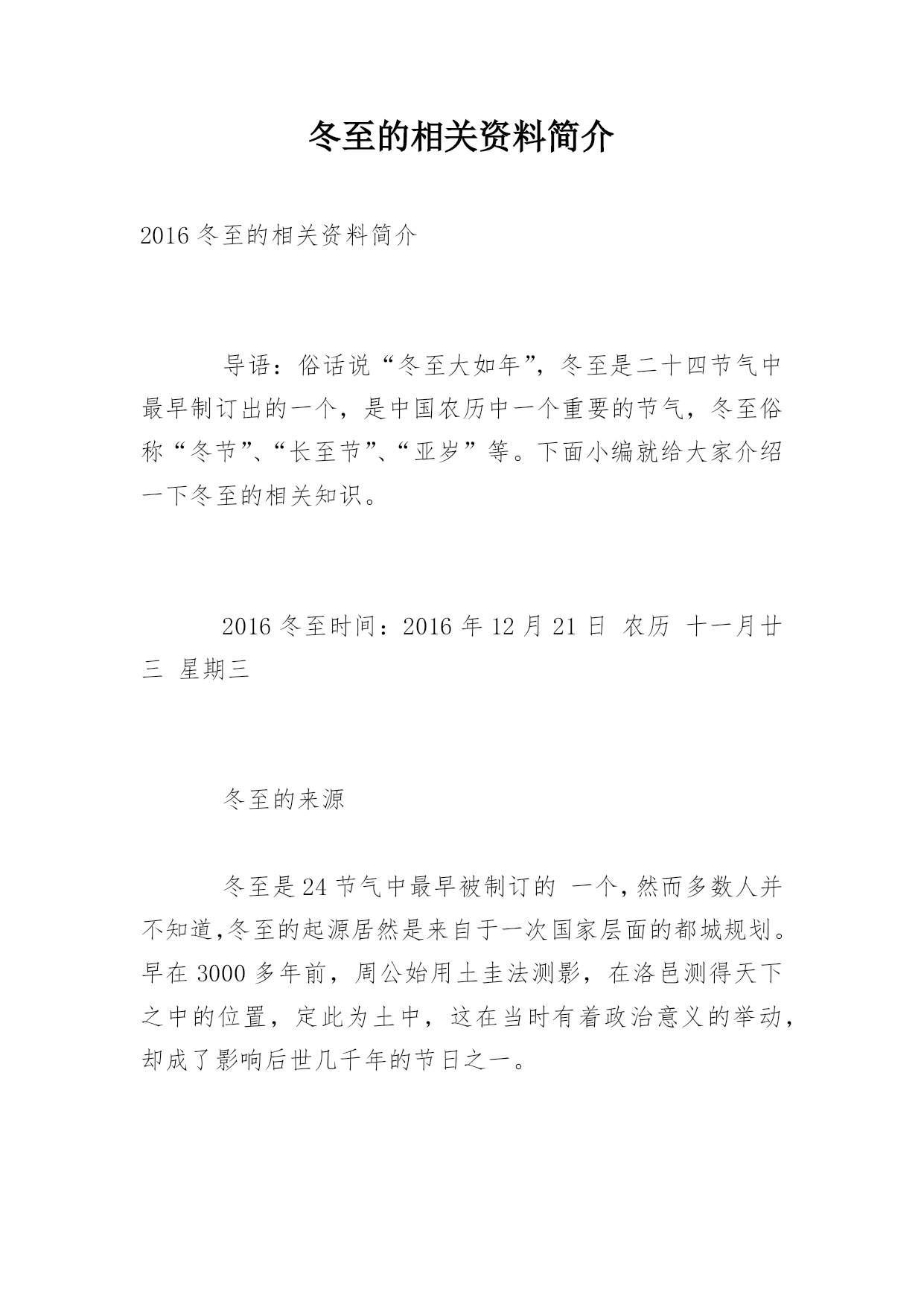 冬至的相关资料简介2016冬至的相关资料简介导语:俗话说“冬至大如年”,冬至是二十四节气中最早制订出的一个,是中国农历中一个重要的节气,冬至俗称“冬节”、“长至节”、“亚岁”等。下面小编就给大家介绍一下冬至的相关知识。2016冬至时间:2016年12月21日农历十一月廿三星期三冬至的来源冬至是24节气中最早被制订的一个,然而多数人并不知道,冬至的起源居然是来自于一次国家层面的都城规划。早在3000多年前,周公始用土圭法测影,在洛邑测得天下之中的位置,定此为土中,这在当时有着政治意义的举动,却成了影响后世几