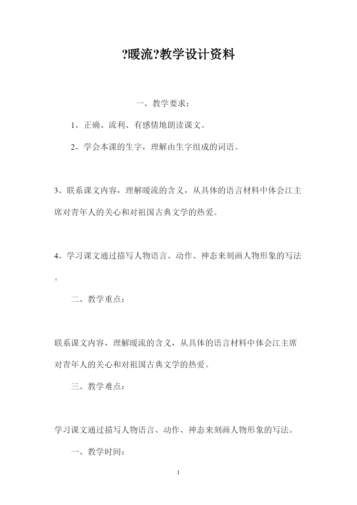 PAGEPAGE6?暖流?教学设计资料一、教学要求:1、正确、流利、有感情地朗读课文。2、学会本课的生字,理解由生字组成的词语。3、联系课文内容,理解暖流的含义,从具体的语言材料中体会江主席对青年人的关心和对祖国古典文学的热爱。4、学习课文通过描写人物语言、动作、神态来刻画人物形象的写法。二、教学重点:联系课文内容,理解暖流的含义,从具体的语言材料中体会江主席对青年人的关心和对祖国古典文学的热爱。三、教学难点:学习课文通过描写人物语言、动作、神态来刻画人物形象的写法。一、教学时间:2课时二、分