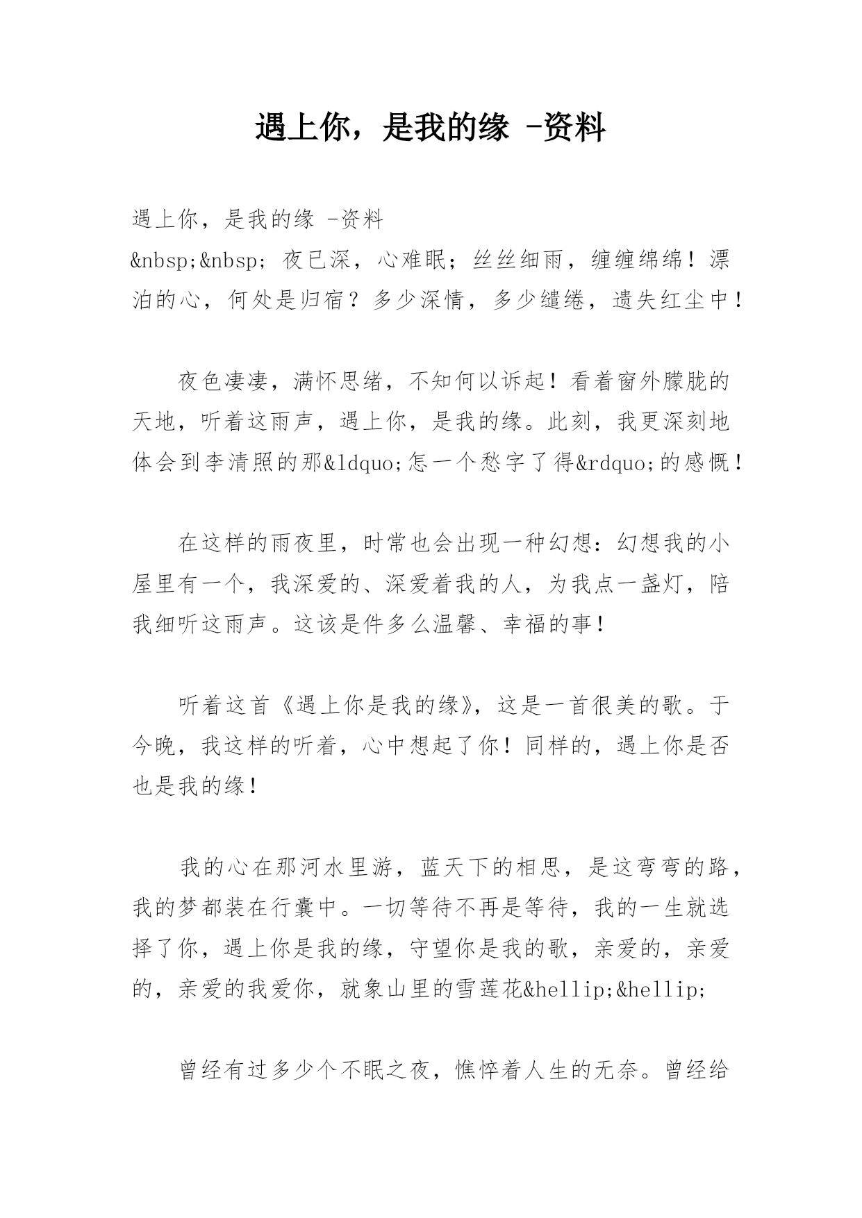遇上你,是我的缘-资料遇上你,是我的缘-资料 夜已深,心难眠;丝丝细雨,缠缠绵绵!漂泊的心,何处是归宿?多少深情,多少缱绻,遗失红尘中!夜色凄凄,满怀思绪,不知何以诉起!看着窗外朦胧的天地,听着这雨声,遇上你,是我的缘。此刻,我更深刻地体会到李清照的那“怎一个愁字了得”的感慨!在这样的雨夜里,时常也会出现一种幻想:幻想我的小屋里有一个,我深爱的、深爱着我的人,为我点一盏灯,陪我细听这雨声。这该是件多么温馨、幸福的事!听着这首《遇上你是我的缘》,这是一首很美的歌