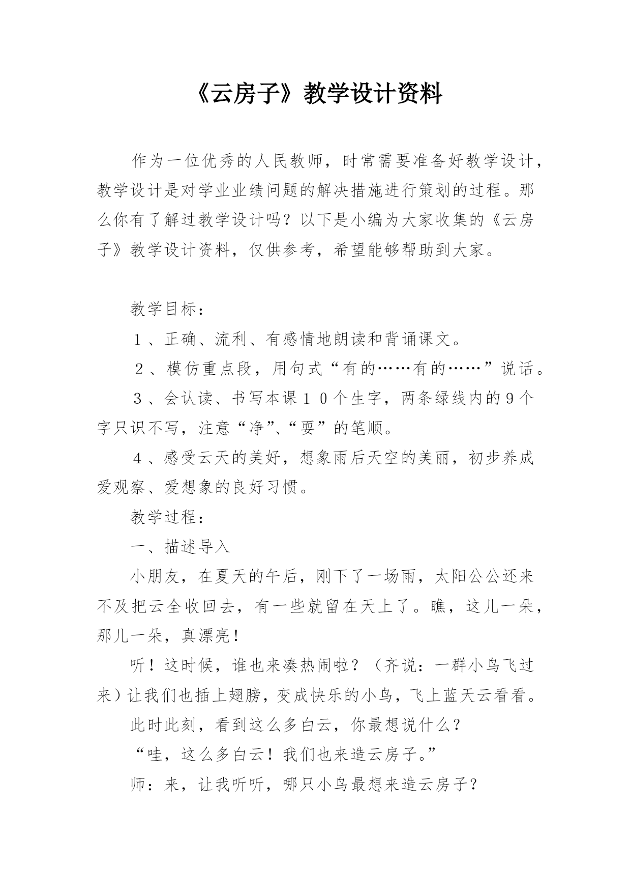 《云房子》教学设计资料作为一位优秀的人民教师,时常需要准备好教学设计,教学设计是对学业业绩问题的解决措施进行策划的过程。那么你有了解过教学设计吗?以下是小编为大家收集的《云房子》教学设计资料,仅供参考,希望能够帮助到大家。教学目标:1、正确、流利、有感情地朗读和背诵课文。2、模仿重点段,用句式“有的……有的……”说话。3、会认读、书写本课10个生字,两条绿线内的9个字只识不写,注意“净”、“耍”的笔顺。4、感受云天的美好,想象雨后天空的美丽,初步养成爱观察、爱想象的良好习惯。教学过程:一、描述导入小朋友,