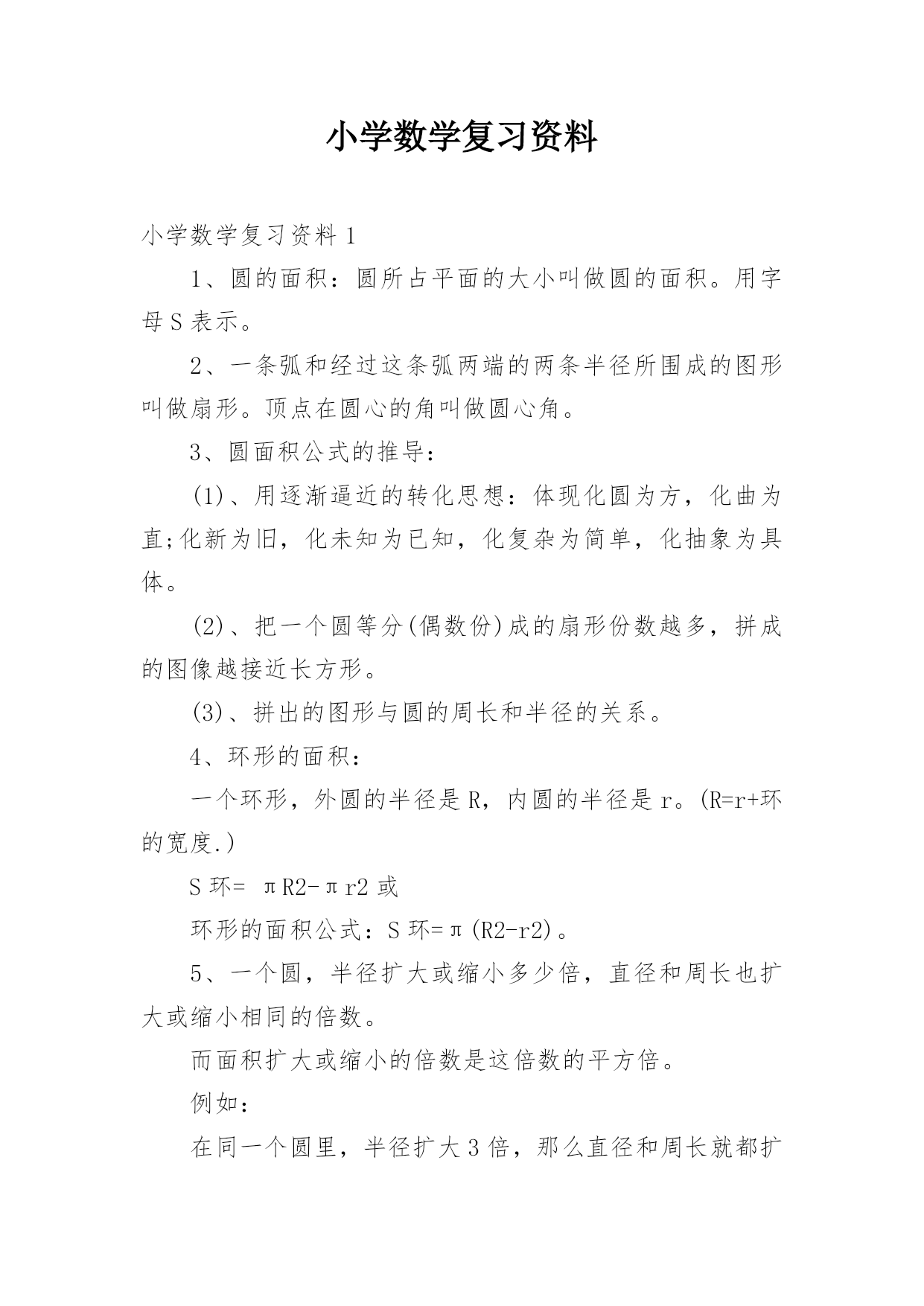 小学数学复习资料小学数学复习资料11、圆的面积:圆所占平面的大小叫做圆的面积。用字母S表示。2、一条弧和经过这条弧两端的两条半径所围成的图形叫做扇形。顶点在圆心的角叫做圆心角。3、圆面积公式的推导:(1)、用逐渐逼近的转化思想:体现化圆为方,化曲为直;化新为旧,化未知为已知,化复杂为简单,化抽象为具体。(2)、把一个圆等分(偶数份)成的扇形份数越多,拼成的图像越接近长方形。(3)、拼出的图形与圆的周长和半径的关系。4、环形的面积:一个环形,外圆的半径是R,内圆的半径是r。(R=r+环的宽度.)S环=πR2