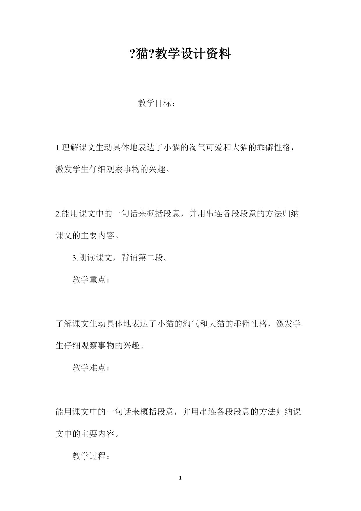 PAGEPAGE5?猫?教学设计资料教学目标:1.理解课文生动具体地表达了小猫的淘气可爱和大猫的乖僻性格,激发学生仔细观察事物的兴趣。2.能用课文中的一句话来概括段意,并用串连各段段意的方法归纳课文的主要内容。3.朗读课文,背诵第二段。教学重点:了解课文生动具体地表达了小猫的淘气和大猫的乖僻性格,激发学生仔细观察事物的兴趣。教学难点:能用课文中的一句话来概括段意,并用串连各段段意的方法归纳课文中的主要内容。教学过程:一1分段,读课文,了解内容,串连各段段意,归纳课文主要内容,背诵第二段。2读课