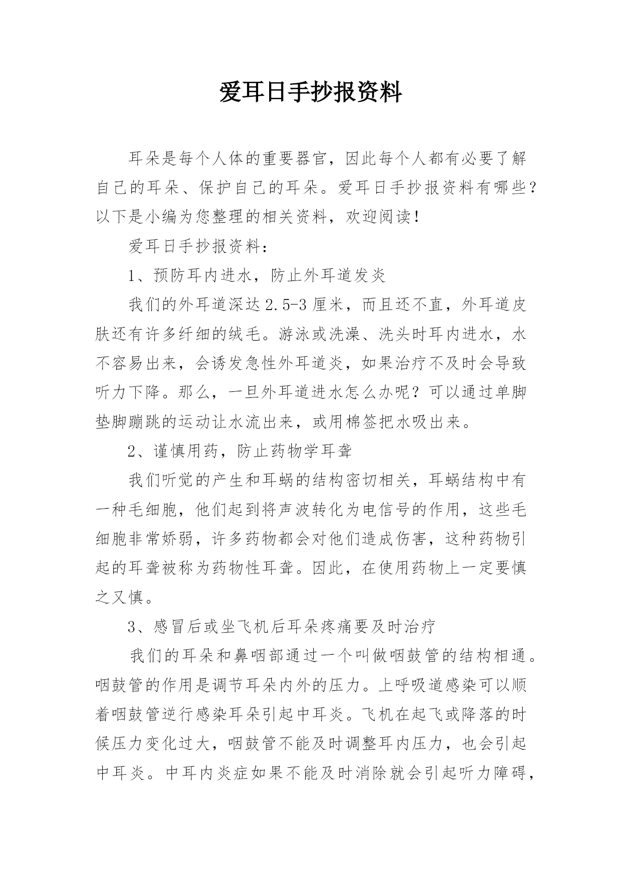 爱耳日手抄报资料耳朵是每个人体的重要器官,因此每个人都有必要了解自己的耳朵、保护自己的耳朵。爱耳日手抄报资料有哪些?以下是小编为您整理的相关资料,欢迎阅读!爱耳日手抄报资料:1、预防耳内进水,防止外耳道发炎我们的外耳道深达2.5-3厘米,而且还不直,外耳道皮肤还有许多纤细的绒毛。游泳或洗澡、洗头时耳内进水,水不容易出来,会诱发急性外耳道炎,如果治疗不及时会导致听力下降。那么,一旦外耳道进水怎么办呢?可以通过单脚垫脚蹦跳的运动让水流出来,或用棉签把水吸出来。2、谨慎用药,防止药物学耳聋我们听觉的产生和耳蜗的