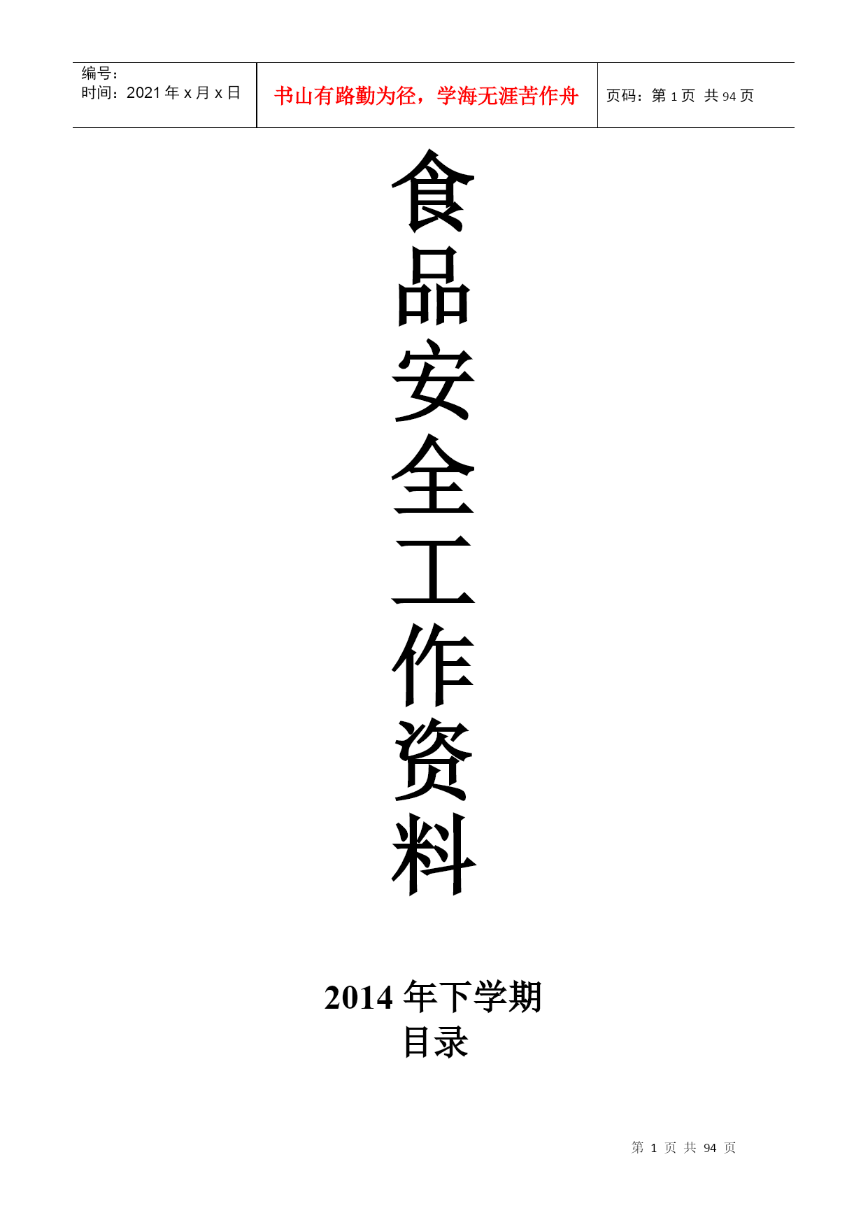 编号:时间:2021年x月x日书山有路勤为径,学海无涯苦作舟页码:第PAGE94页共NUMPAGES94页第PAGE\*MERGEFORMAT94页共NUMPAGES\*MERGEFORMAT94页食品安全工作资料2014年下学期目录食堂食品安全管理组织机构安全事故应急预案安全责任书从业人员基本情况记录表培训记录消毒记录表食品留样记录表食品采购与进货验收台账新开镇共和完小食堂食品安全管理组织机构组长:李俊副组长:陈三选组员:方爱社谭元食品安全事故应急预案为有效预防、及时控制和妥善处