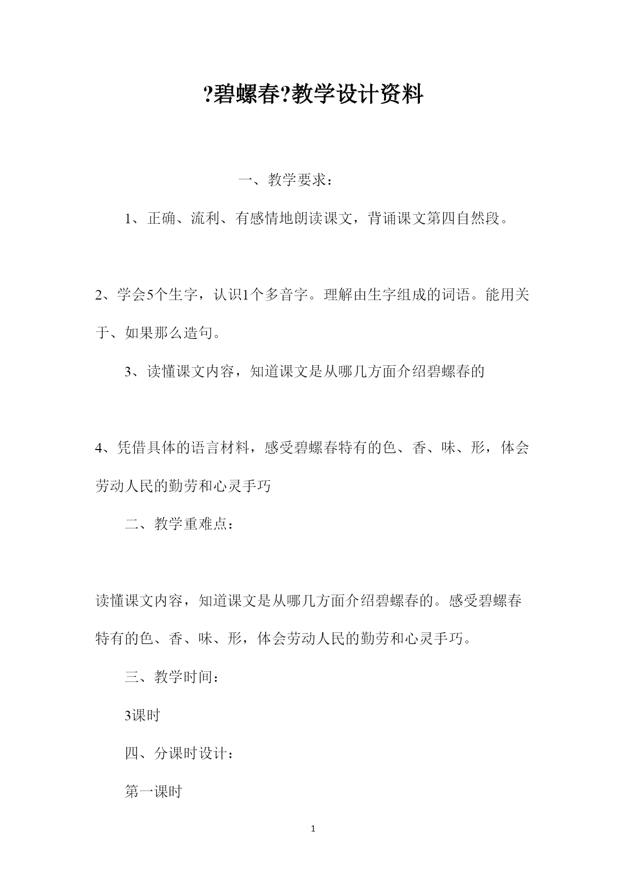 PAGEPAGE5?碧螺春?教学设计资料一、教学要求:1、正确、流利、有感情地朗读课文,背诵课文第四自然段。2、学会5个生字,认识1个多音字。理解由生字组成的词语。能用关于、如果那么造句。3、读懂课文内容,知道课文是从哪几方面介绍碧螺春的4、凭借具体的语言材料,感受碧螺春特有的色、香、味、形,体会劳动人民的勤劳和心灵手巧二、教学重难点:读懂课文内容,知道课文是从哪几方面介绍碧螺春的。感受碧螺春特有的色、香、味、形,体会劳动人民的勤劳和心灵手巧。三、教学时间:3课时四、分课时设计:第一课时一、课