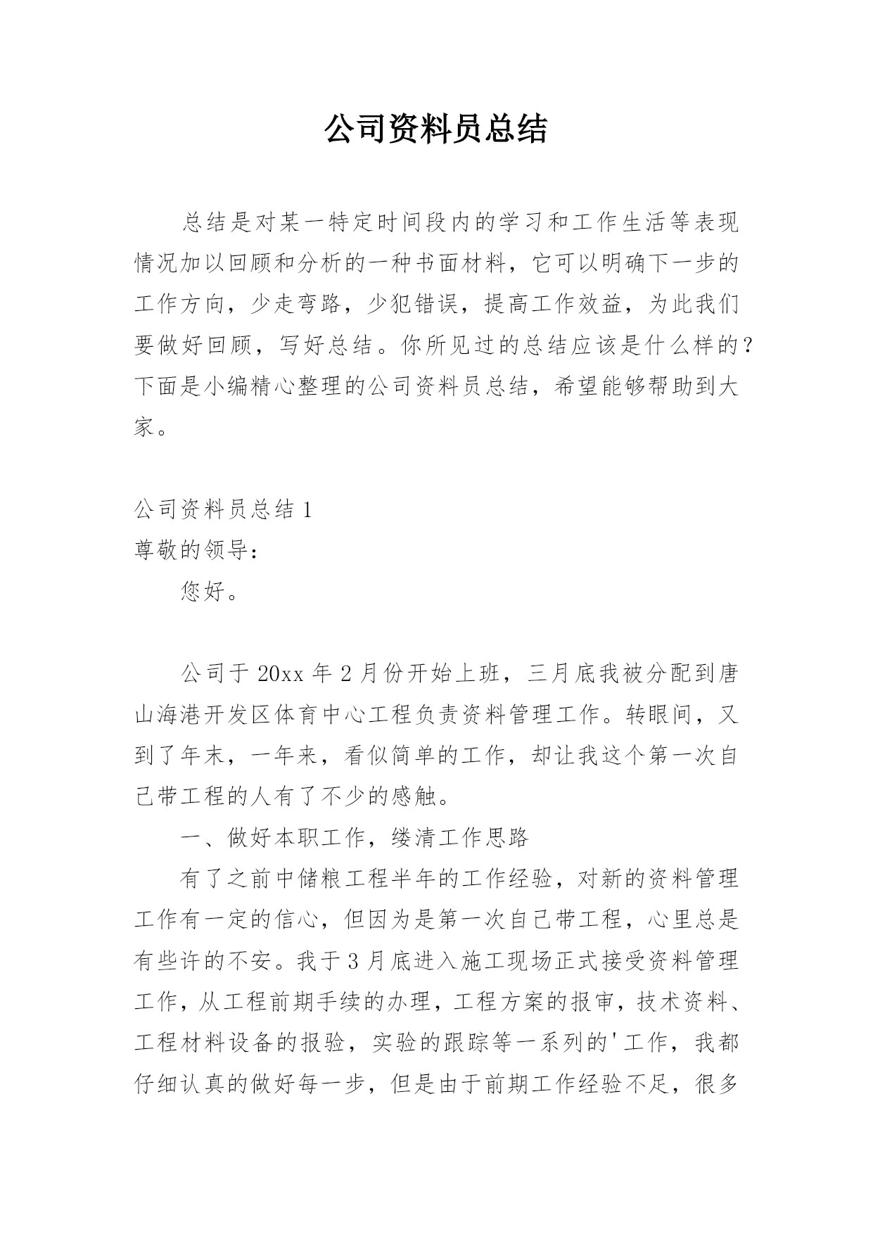 公司资料员总结总结是对某一特定时间段内的学习和工作生活等表现情况加以回顾和分析的一种书面材料,它可以明确下一步的工作方向,少走弯路,少犯错误,提高工作效益,为此我们要做好回顾,写好总结。你所见过的总结应该是什么样的?下面是小编精心整理的公司资料员总结,希望能够帮助到大家。公司资料员总结1尊敬的领导:您好。公司于20xx年2月份开始上班,三月底我被分配到唐山海港开发区体育中心工程负责资料管理工作。转眼间,又到了年末,一年来,看似简单的工作,却让我这个第一次自己带工程的人有了不少的感触。一、做好本职工作,缕清