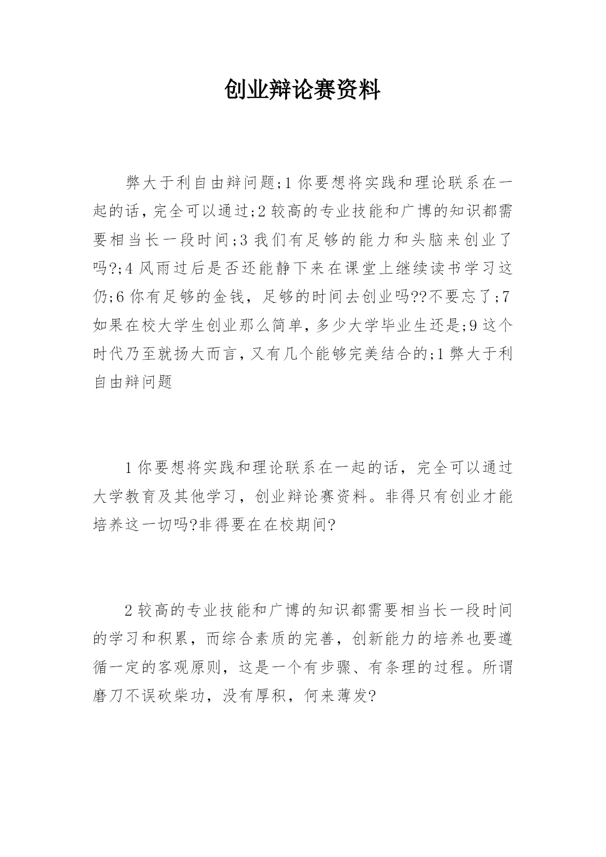 创业辩论赛资料弊大于利自由辩问题;1你要想将实践和理论联系在一起的话,完全可以通过;2较高的专业技能和广博的知识都需要相当长一段时间;3我们有足够的能力和头脑来创业了吗?;4风雨过后是否还能静下来在课堂上继续读书学习这仍;6你有足够的金钱,足够的时间去创业吗??不要忘了;7如果在校大学生创业那么简单,多少大学毕业生还是;9这个时代乃至就扬大而言,又有几个能够完美结合的;1弊大于利自由辩问题1你要想将实践和理论联系在一起的话,完全可以通过大学教育及其他学习,创业辩论赛资料。非得只有创业才能培养这一切吗?非得