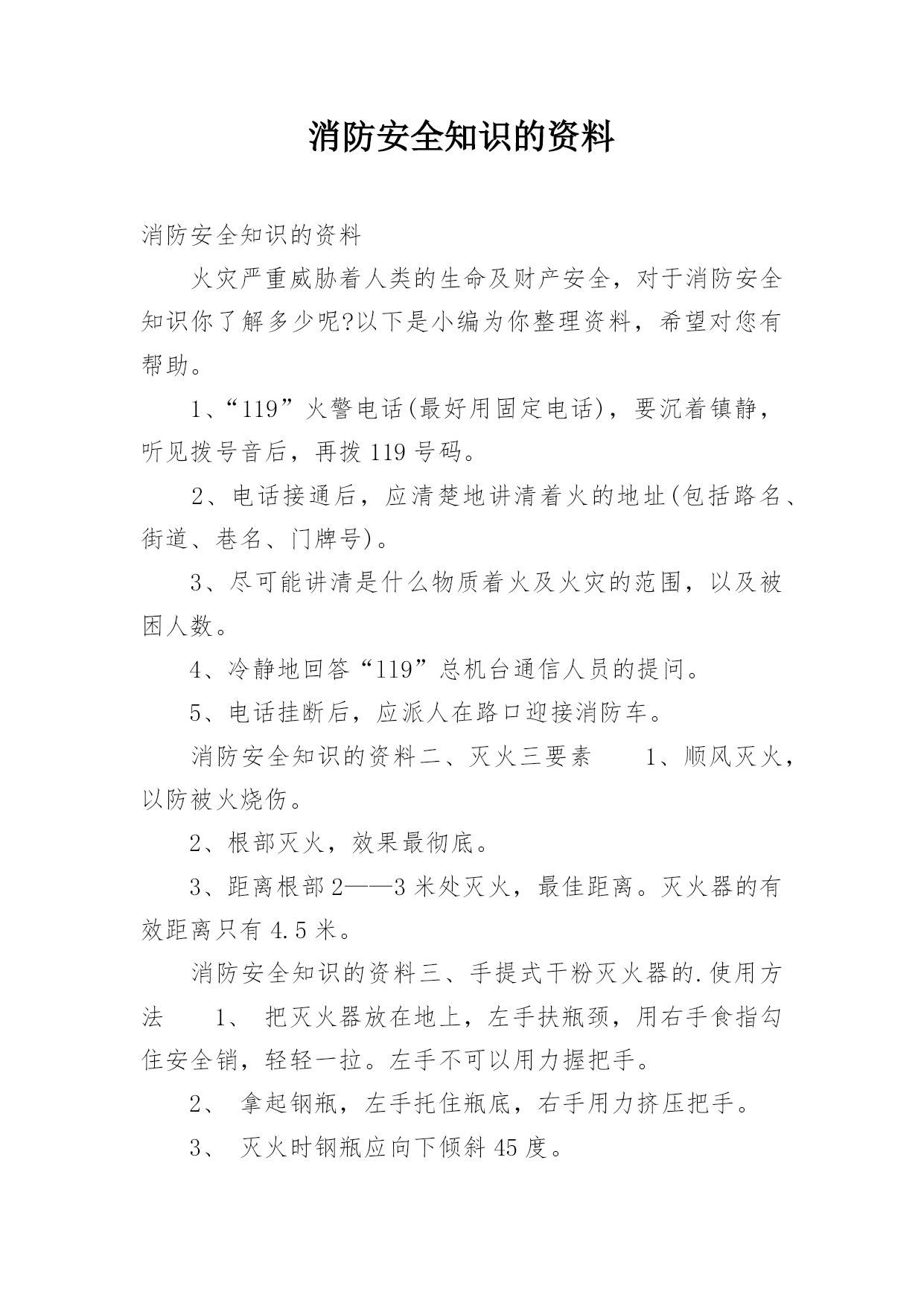消防安全知识的资料消防安全知识的资料火灾严重威胁着人类的生命及财产安全,对于消防安全知识你了解多少呢?以下是小编为你整理资料,希望对您有帮助。1、“119”火警电话(最好用固定电话),要沉着镇静,听见拨号音后,再拨119号码。2、电话接通后,应清楚地讲清着火的地址(包括路名、街道、巷名、门牌号)。3、尽可能讲清是什么物质着火及火灾的范围,以及被困人数。4、冷静地回答“ll9”总机台通信人员的提问。5、电话挂断后,应派人在路口迎接消防车。消防安全知识的资料二、灭火三要素1、顺风灭火,以防被火烧伤。2、根部灭