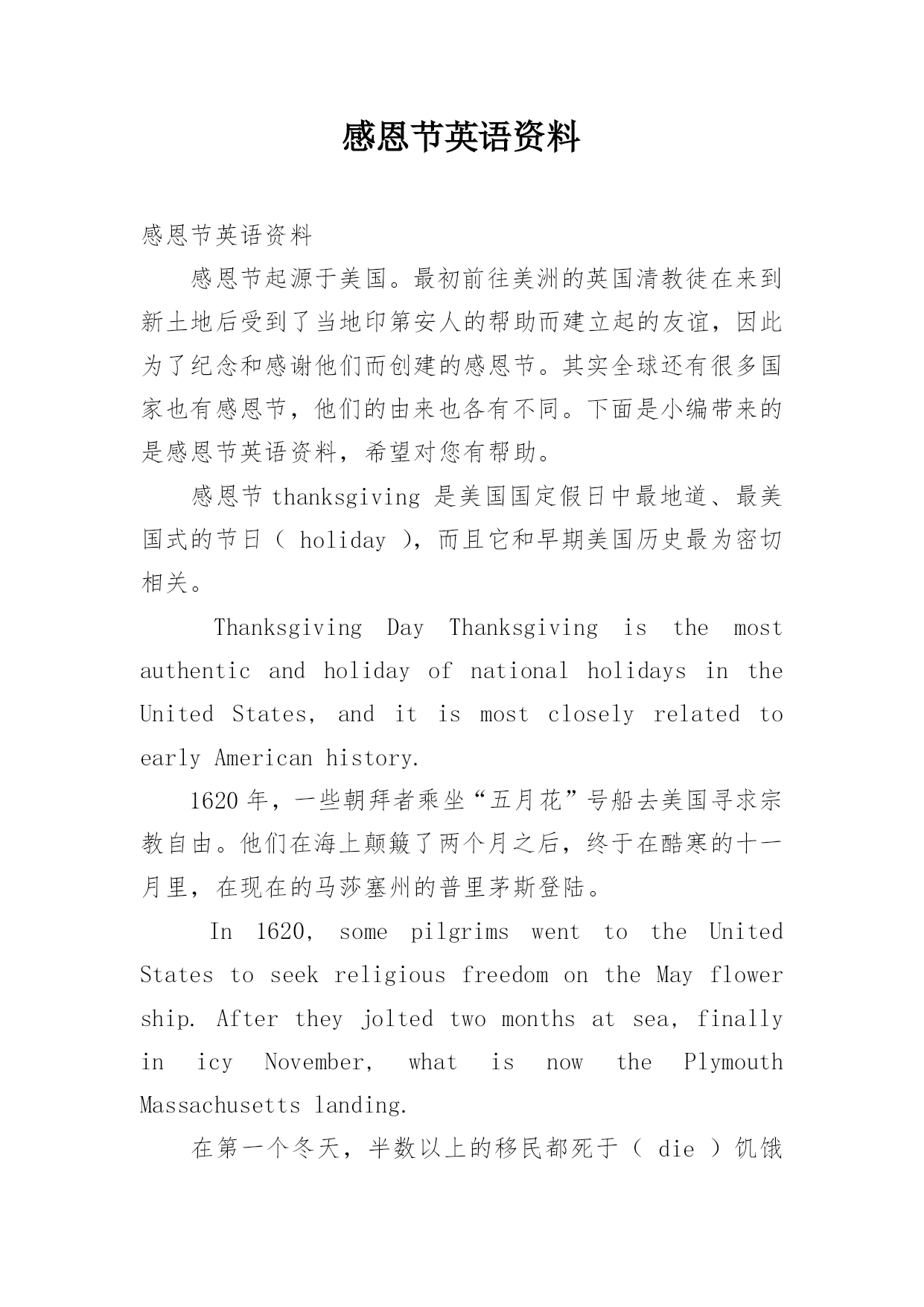感恩节英语资料感恩节英语资料感恩节起源于美国。最初前往美洲的英国清教徒在来到新土地后受到了当地印第安人的帮助而建立起的友谊,因此为了纪念和感谢他们而创建的感恩节。其实全球还有很多国家也有感恩节,他们的由来也各有不同。下面是小编带来的是感恩节英语资料,希望对您有帮助。感恩节thanksgiving是美国国定假日中最地道、最美国式的节日(holiday),而且它和早期美国历史最为密切相关。ThanksgivingDayThanksgivingisthemostauthenticandholidayofnati