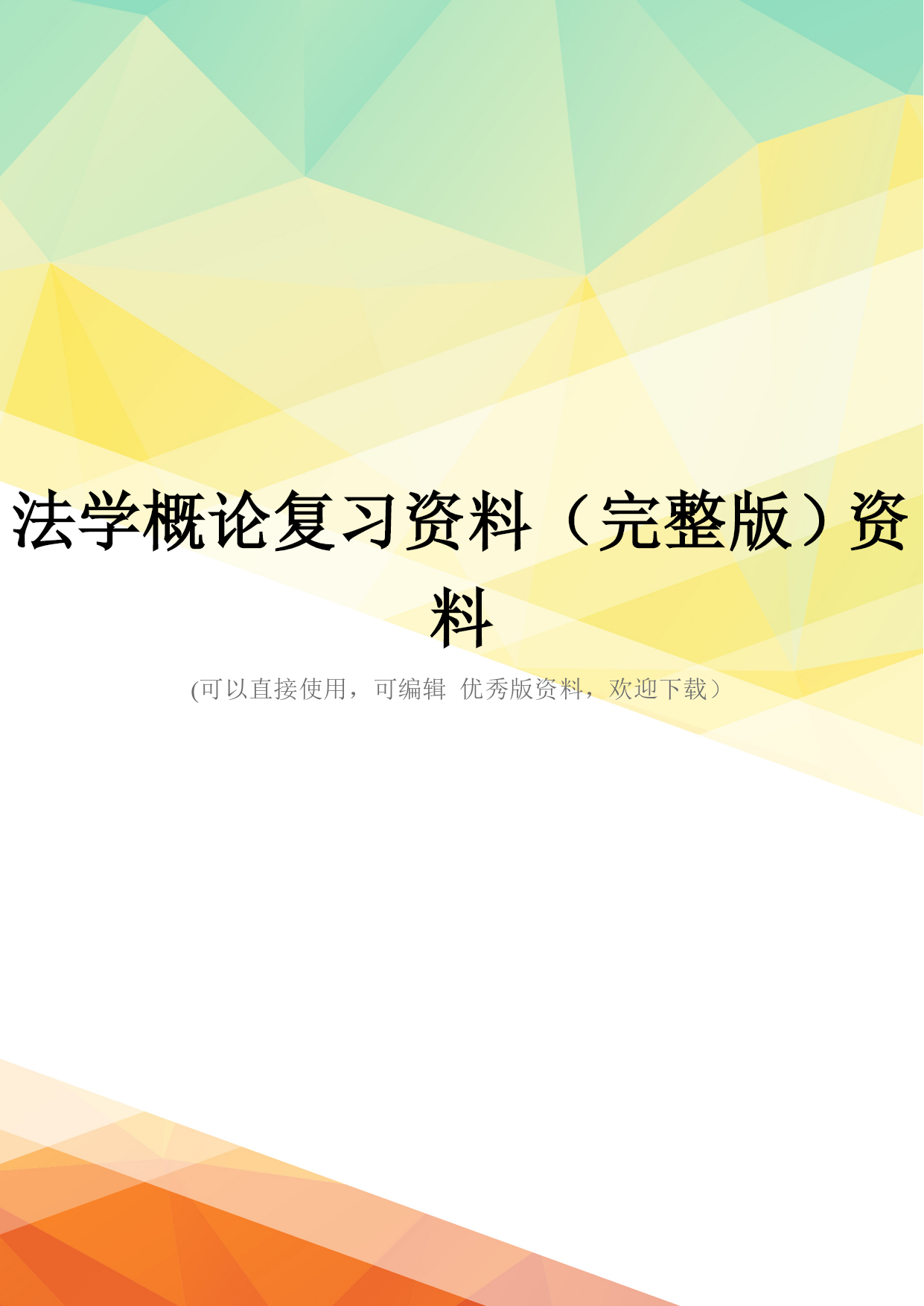 法学概论复习资料(完整版)资料(可以直接使用,可编辑优秀版资料,欢迎下载)法学概论(0040)自考“法学概论”听课笔记(1)第一章法律的一般原理第一节法律的起源1、法律产生的社会根源法律是生产力发展到一定阶段,伴随生产资料私有制、阶级和国家的出现而产生的。法律产生的过程直接受两个决定性因素的影响:(1)商品交换和私有制的出现;(2)奴隶制的出现。2、法律产生的一般规律性(1)法律和国家同时产生;(2)由习惯到习惯法、再由习惯法到制定法;(3)不断地从个别调整上升为一般调整;(4)从权利、义务的合一到权利、