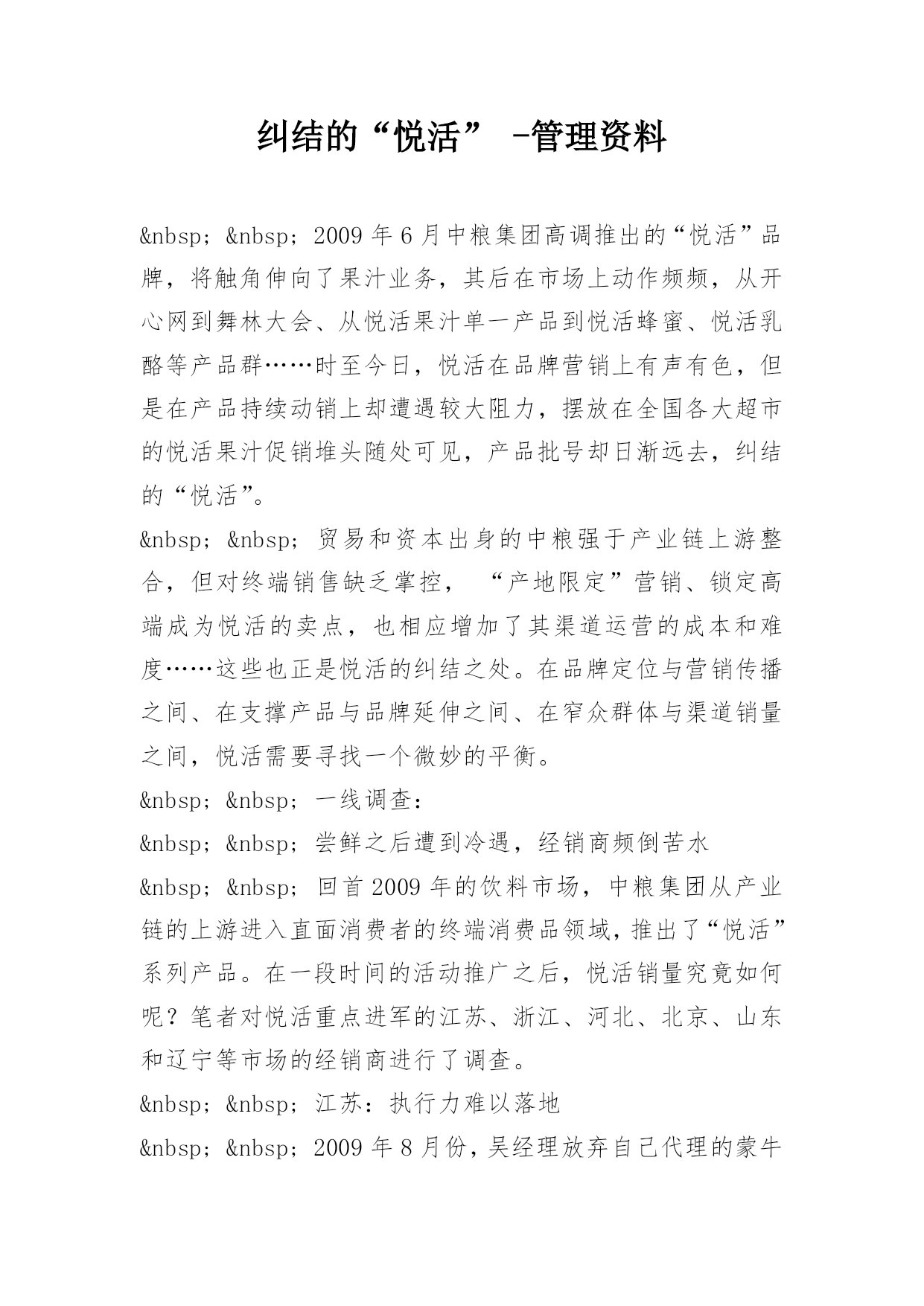 纠结的“悦活”-管理资料 2009年6月中粮集团高调推出的“悦活”品牌,将触角伸向了果汁业务,其后在市场上动作频频,从开心网到舞林大会、从悦活果汁单一产品到悦活蜂蜜、悦活乳酪等产品群……时至今日,悦活在品牌营销上有声有色,但是在产品持续动销上却遭遇较大阻力,摆放在全国各大超市的悦活果汁促销堆头随处可见,产品批号却日渐远去,纠结的“悦活”。 贸易和资本出身的中粮强于产业链上游整合,但对终端销售缺乏掌控,“产地限定”营销、锁定高端成为悦活的卖点,也相应增加了其渠道运