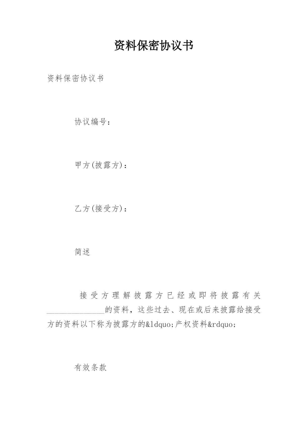 资料保密协议书资料保密协议书协议编号:甲方(披露方):乙方(接受方):简述接受方理解披露方已经或即将披露有关______________的资料,这些过去、现在或后来披露给接受方的资料以下称为披露方的“产权资料”有效条款1.对披露方披露的产权资料,接受方在此同意:(i)严守产权资料机密,并采取所有预防措施保护该产权资料(包括但不仅限于接受方为保护其自有机密材料所采用的措施),(ii)不泄露任何产权资料或源自于产权资料的任何资料给任何第三方,(iii)除用于内部评估其与披露方的关系之外