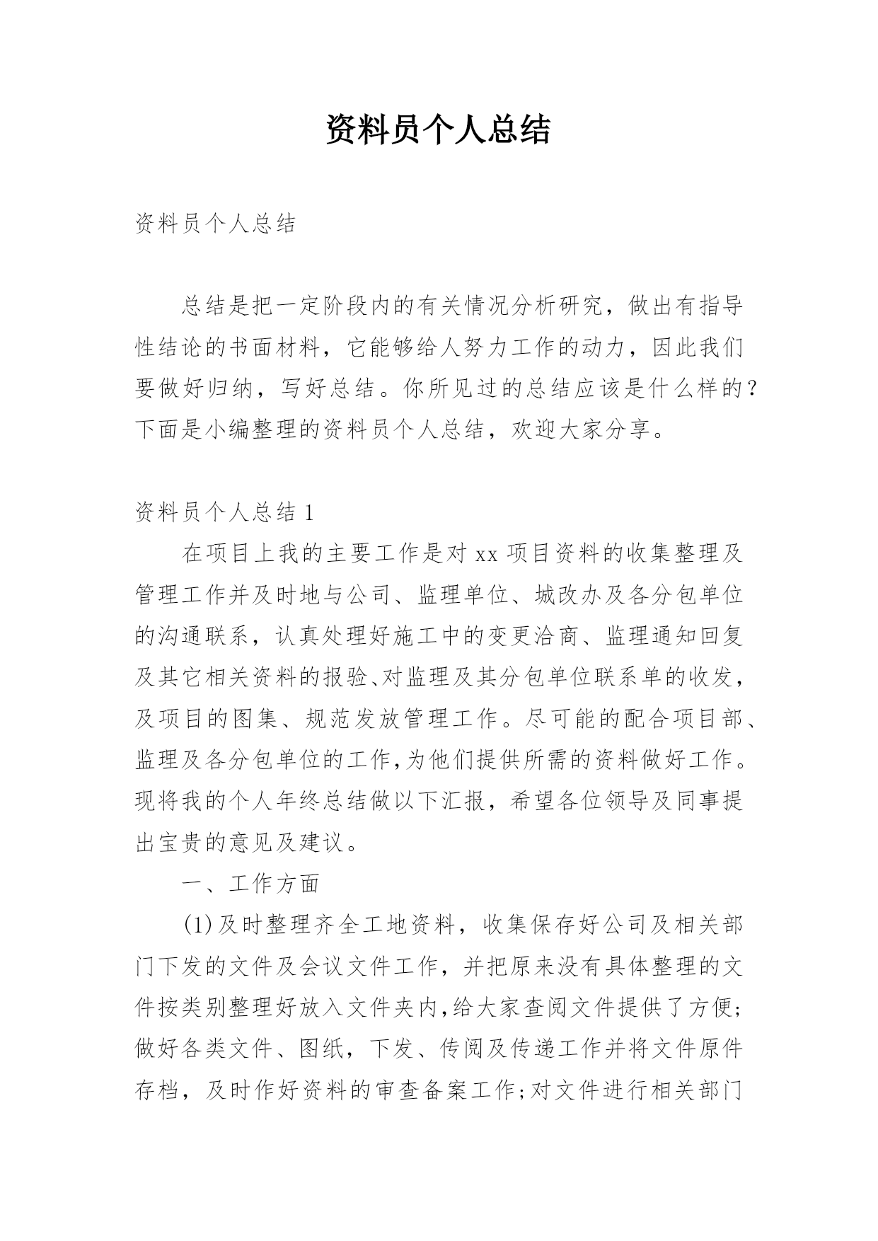 资料员个人总结资料员个人总结总结是把一定阶段内的有关情况分析研究,做出有指导性结论的书面材料,它能够给人努力工作的动力,因此我们要做好归纳,写好总结。你所见过的总结应该是什么样的?下面是小编整理的资料员个人总结,欢迎大家分享。资料员个人总结1在项目上我的主要工作是对xx项目资料的收集整理及管理工作并及时地与公司、监理单位、城改办及各分包单位的沟通联系,认真处理好施工中的变更洽商、监理通知回复及其它相关资料的报验、对监理及其分包单位联系单的收发,及项目的图集、规范发放管理工作。尽可能的配合项目部、监理及各分