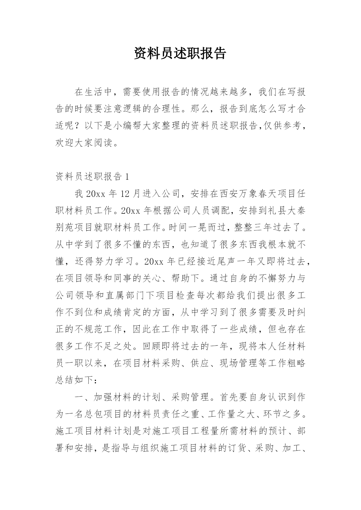 资料员述职报告在生活中,需要使用报告的情况越来越多,我们在写报告的时候要注意逻辑的合理性。那么,报告到底怎么写才合适呢?以下是小编帮大家整理的资料员述职报告,仅供参考,欢迎大家阅读。资料员述职报告1我20xx年12月进入公司,安排在西安万象春天项目任职材料员工作。20xx年根据公司人员调配,安排到礼县大秦别苑项目就职材料员工作。时间一晃而过,整整三年过去了。从中学到了很多不懂的东西,也知道了很多东西我根本就不懂,还得努力学习。20xx年已经接近尾声一年又即将过去,在项目领导和同事的关心、帮助下。通过自身的