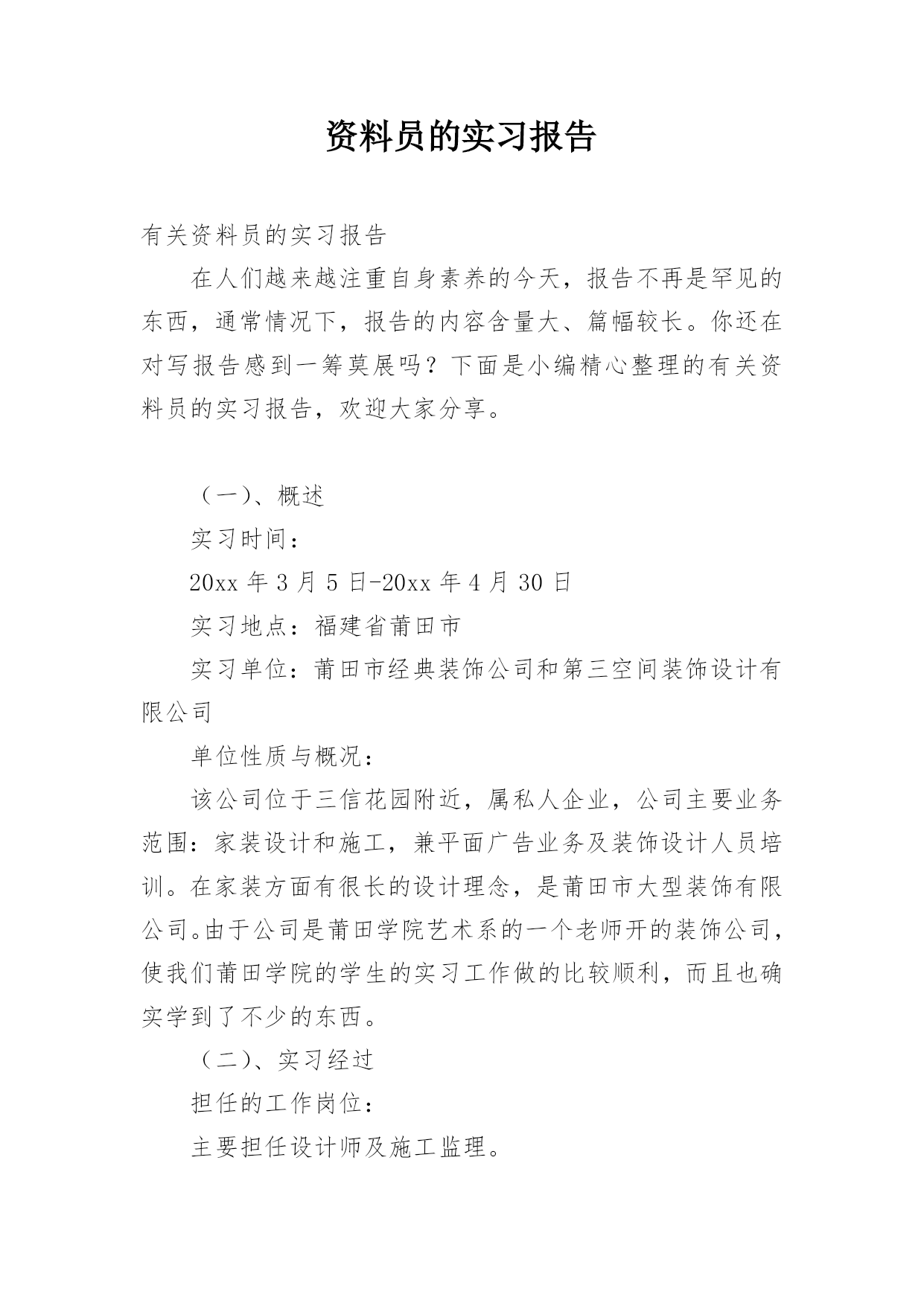 资料员的实习报告有关资料员的实习报告在人们越来越注重自身素养的今天,报告不再是罕见的东西,通常情况下,报告的内容含量大、篇幅较长。你还在对写报告感到一筹莫展吗?下面是小编精心整理的有关资料员的实习报告,欢迎大家分享。(一)、概述实习时间:20xx年3月5日-20xx年4月30日实习地点:福建省莆田市实习单位:莆田市经典装饰公司和第三空间装饰设计有限公司单位性质与概况:该公司位于三信花园附近,属私人企业,公司主要业务范围:家装设计和施工,兼平面广告业务及装饰设计人员培训。在家装方面有很长的设计理念,是莆田市