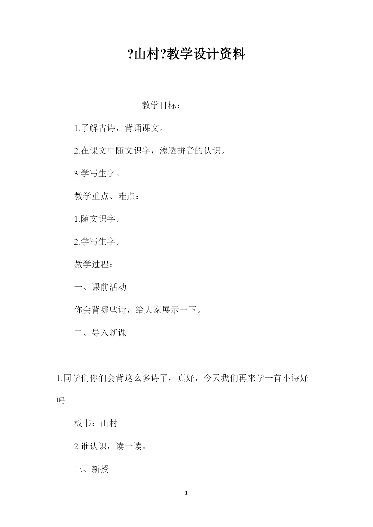 PAGEPAGE6?山村?教学设计资料教学目标:1.了解古诗,背诵课文。2.在课文中随文识字,渗透拼音的认识。3.学写生字。教学重点、难点:1.随文识字。2.学写生字。教学过程:一、课前活动你会背哪些诗,给大家展示一下。二、导入新课1.同学们你们会背这么多诗了,真好,今天我们再来学一首小诗好吗板书:山村2.谁认识,读一读。三、新授1.翻开书翻到P12页,请你读一读小诗,用你喜欢的符号画出不认识的字。2.有的同学已经都能流畅地读下来,谁愿意展示一下〔请一生读〕其他同学要想把自己不认识的字解决,你