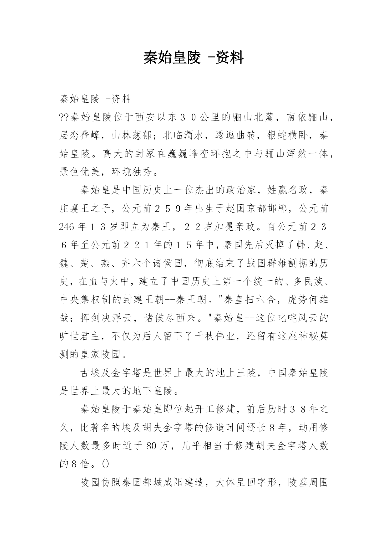 秦始皇陵-资料秦始皇陵-资料??秦始皇陵位于西安以东30公里的骊山北麓,南依骊山,层恋叠嶂,山林葱郁;北临渭水,逶迤曲转,银蛇横卧,秦始皇陵。高大的封冢在巍巍峰峦环抱之中与骊山浑然一体,景色优美,环境独秀。秦始皇是中国历史上一位杰出的政治家,姓蠃名政,秦庄襄王之子,公元前259年出生于赵国京都邯郸,公元前246年13岁即立为秦王,22岁加冕亲政。自公元前236年至公元前221年的15年中,秦国先后灭掉了韩、赵、魏、楚、燕、齐六个诸侯国,彻底结束了战国群雄割据的历史,在血与火中,建立了中国历史上第一个统一的