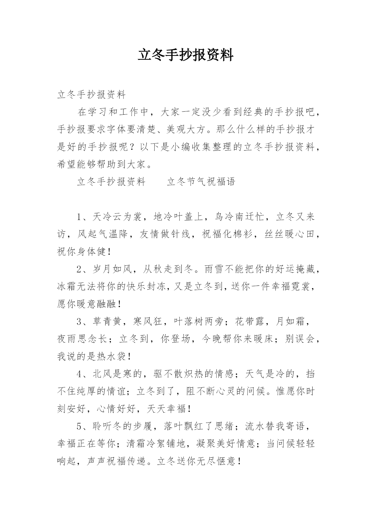 立冬手抄报资料立冬手抄报资料在学习和工作中,大家一定没少看到经典的手抄报吧,手抄报要求字体要清楚、美观大方。那么什么样的手抄报才是好的手抄报呢?以下是小编收集整理的立冬手抄报资料,希望能够帮助到大家。立冬手抄报资料立冬节气祝福语1、天冷云为裳,地冷叶盖上,鸟冷南迁忙,立冬又来访,风起气温降,友情做针线,祝福化棉衫,丝丝暖心田,祝你身体健!2、岁月如风,从秋走到冬。雨雪不能把你的好运掩藏,冰霜无法将你的快乐封冻,又是立冬到,送你一件幸福霓裳,愿你暖意融融!3、草青黄,寒风狂,叶落树两旁;花带露,月如霜,夜雨