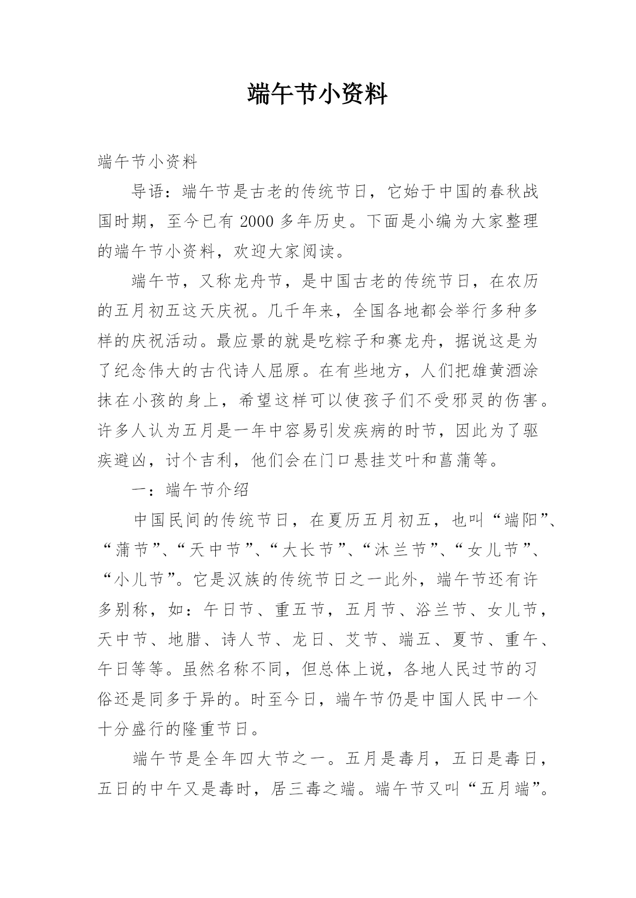 端午节小资料端午节小资料导语:端午节是古老的传统节日,它始于中国的春秋战国时期,至今已有2000多年历史。下面是小编为大家整理的端午节小资料,欢迎大家阅读。端午节,又称龙舟节,是中国古老的传统节日,在农历的五月初五这天庆祝。几千年来,全国各地都会举行多种多样的庆祝活动。最应景的就是吃粽子和赛龙舟,据说这是为了纪念伟大的古代诗人屈原。在有些地方,人们把雄黄酒涂抹在小孩的身上,希望这样可以使孩子们不受邪灵的伤害。许多人认为五月是一年中容易引发疾病的时节,因此为了驱疾避凶,讨个吉利,他们会在门口悬挂艾叶和菖蒲等