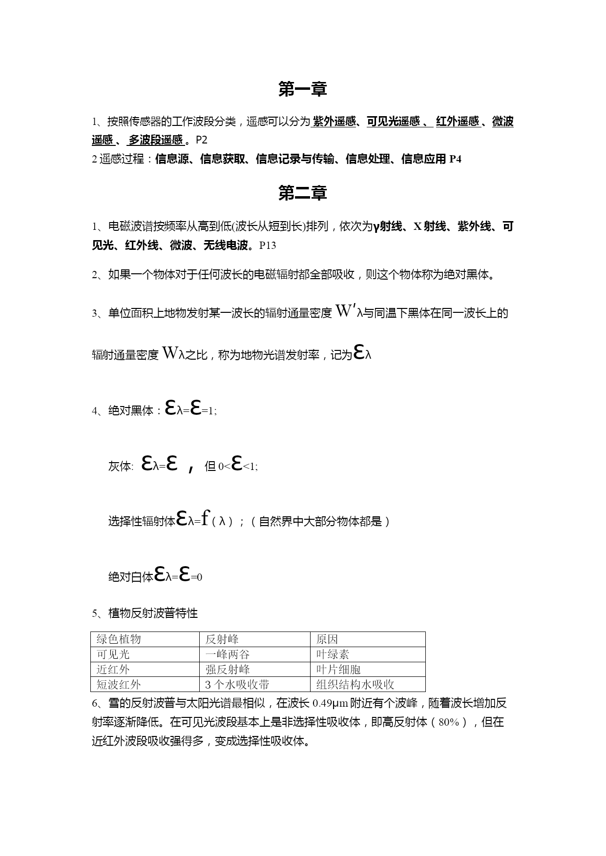 第一章1、按照传感器的工作波段分类,遥感可以分为紫外遥感、可见光遥感、红外遥感、微波遥感、多波段遥感。P22遥感过程:信息源、信息获取、信息记录与传输、信息处理、信息应用P4第二章1、电磁波谱按频率从高到低(波长从短到长)排列,依次为γ射线、X射线、紫外线、可见光、红外线、微波、无线电波。P132、如果一个物体对于任何波长的电磁辐射都全部吸收,则这个物体称为绝对黑体。3、单位面积上地物发射某一波长的辐射通量密度W′λ与同温下黑体在同一波长上的辐射通量密度Wλ之比,称为地物光谱发射率,记为ελ4、绝对黑体: