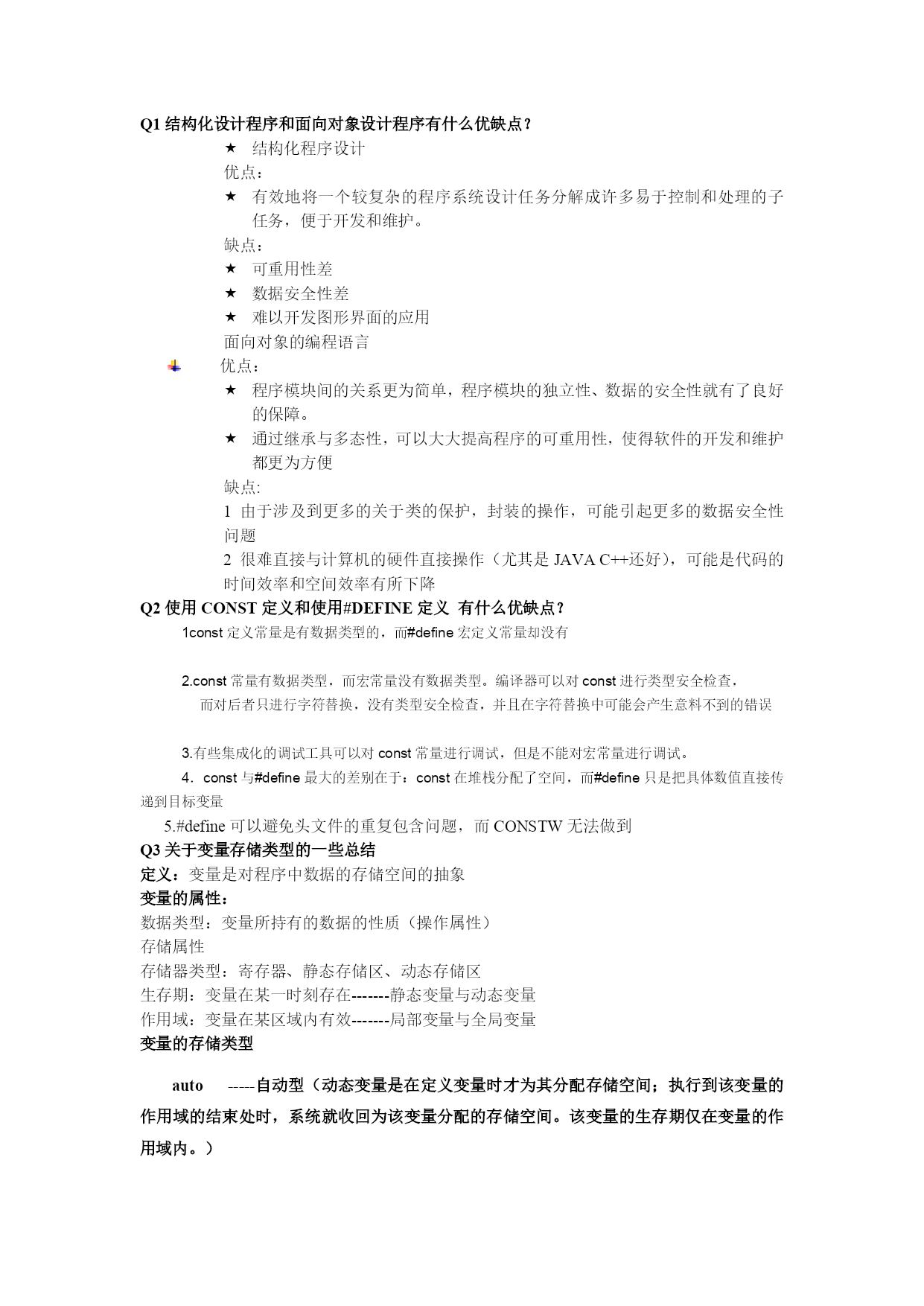 Q1结构化设计程序和面向对象设计程序有什么优缺点?结构化程序设计优点:有效地将一个较复杂的程序系统设计任务分解成许多易于控制和处理的子任务,便于开发和维护。缺点:可重用性差数据安全性差难以开发图形界面的应用面向对象的编程语言优点:程序模块间的关系更为简单,程序模块的独立性、数据的安全性就有了良好的保障。通过继承与多态性,可以大大提高程序的可重用性,使得软件的开发和维护都更为方便缺点:1由于涉及到更多的关于类的保护,封装的操作,可能引起更多的数据安全性问题2很难直接与计算机的硬件直接操作(尤其是JAVAC+