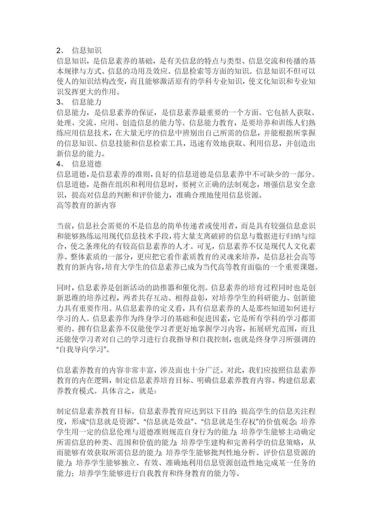 2、信息知识信息知识,是信息素养的基础,是有关信息的特点与类型、信息交流和传播的基本规律与方式、信息的功用及效应、信息检索等方面的知识。信息知识不但可以使人的知识结构改变,而且能够激活原有的学科专业知识,使文化知识和专业知识发挥更大的作用。3、信息能力信息能力,是信息素养的保证,是信息素养最重要的一个方面。它包括人获取、处理、交流、应用、创造信息的能力等。信息能力教育,是要培养和训练人们熟练应用信息技术,在大量无序的信息中辨别出自己所需的信息,并能根据所掌握的信息知识、信息技能和信息检索工具,迅速有效地获