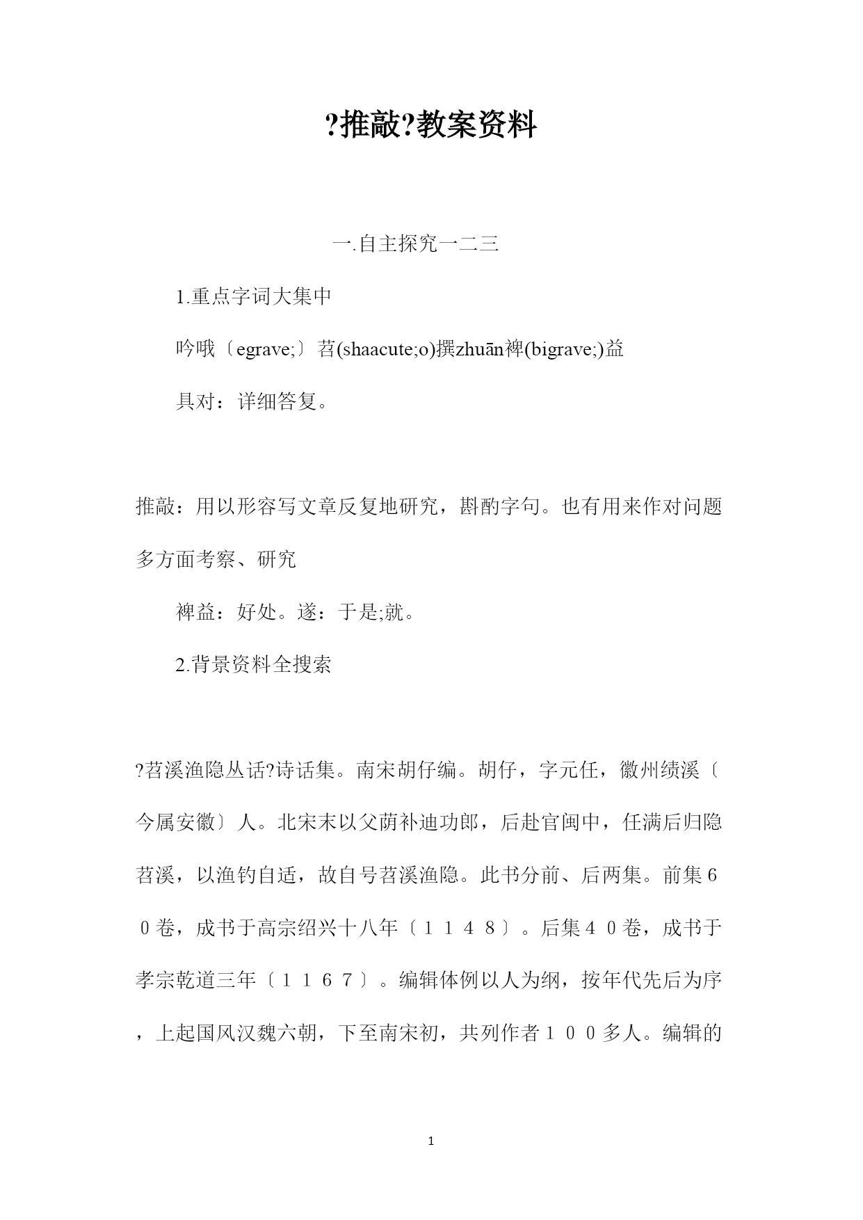 PAGEPAGE22?推敲?教案资料一.自主探究一二三1.重点字词大集中吟哦〔egrave;〕苕(shaacute;o)撰zhuān裨(bigrave;)益具对:详细答复。推敲:用以形容写文章反复地研究,斟酌字句。也有用来作对问题多方面考察、研究裨益:好处。遂:于是;就。2.背景资料全搜索?苕溪渔隐丛话?诗话集。南宋胡仔编。胡仔,字元任,徽州绩溪〔今属安徽〕人。北宋末以父荫补迪功郎,后赴官闽中,任满后归隐苕溪,以渔钓自适,故自号苕溪渔隐。此书分前、后两集。前集60卷,成书于高宗绍兴十八年〔11