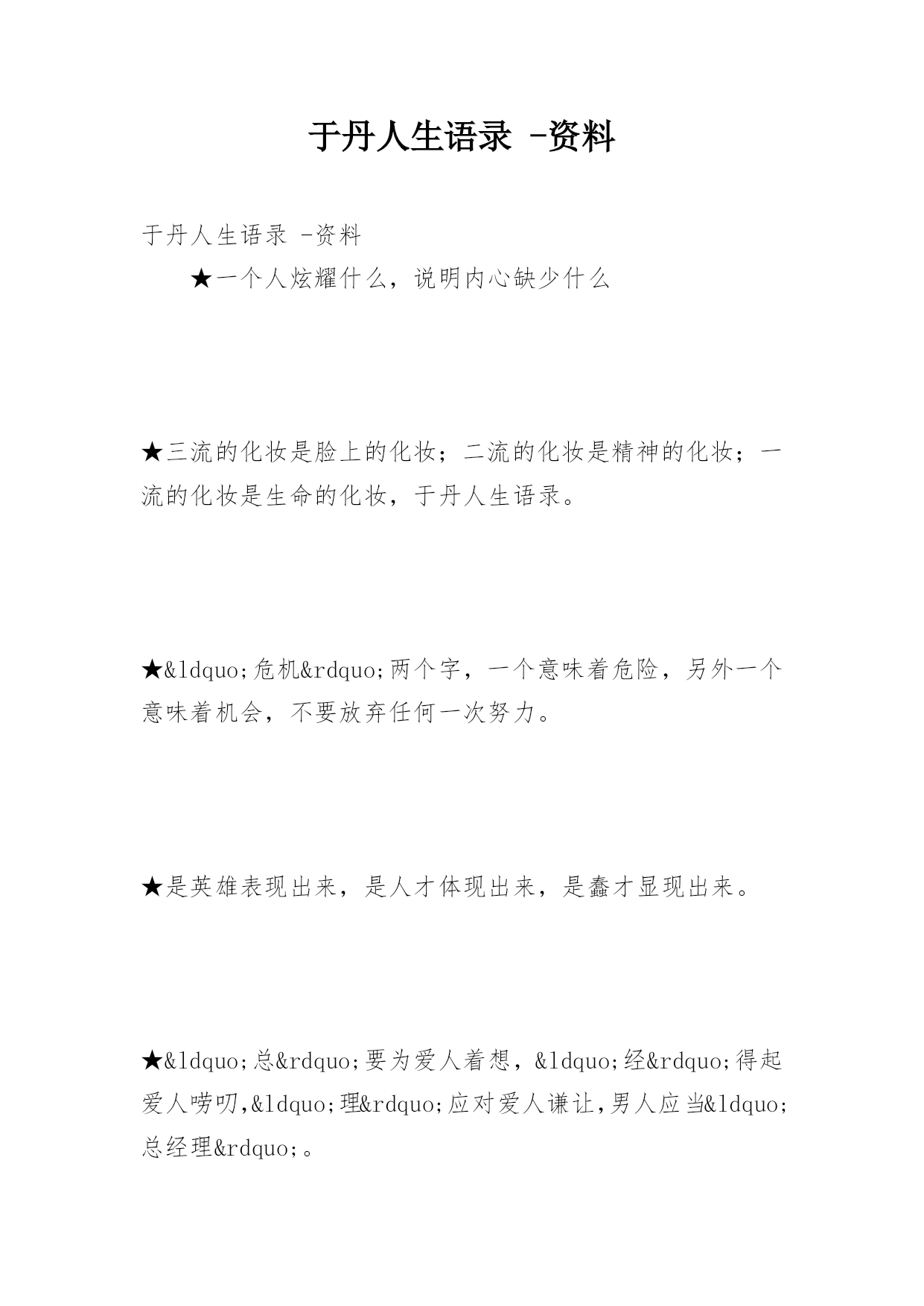 于丹人生语录-资料于丹人生语录-资料★一个人炫耀什么,说明内心缺少什么★三流的化妆是脸上的化妆;二流的化妆是精神的化妆;一流的化妆是生命的化妆,于丹人生语录。★“危机”两个字,一个意味着危险,另外一个意味着机会,不要放弃任何一次努力。★是英雄表现出来,是人才体现出来,是蠢才显现出来。★“总”要为爱人着想,“经”得起爱人唠叨,“理”应对爱人谦让,男人应当“总经理”。★三人行,必有我师,三剑