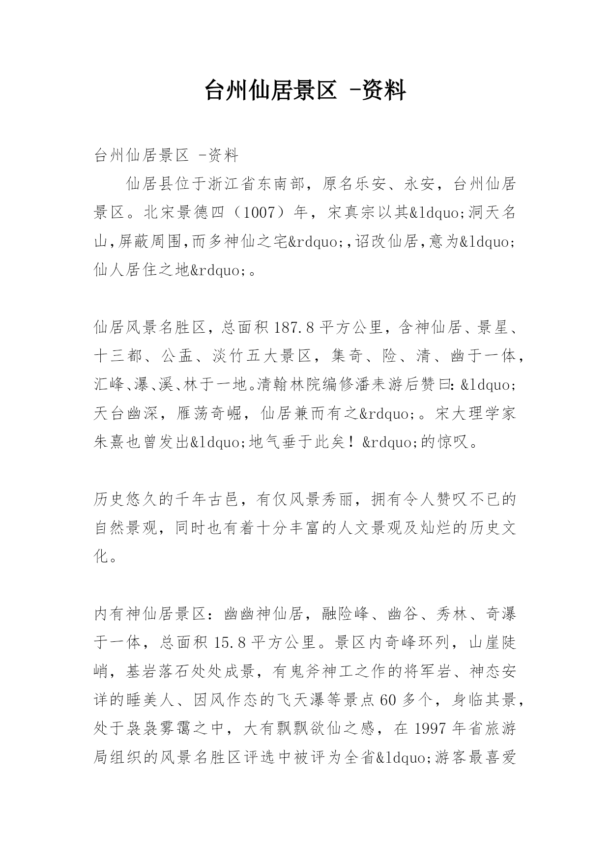 台州仙居景区-资料台州仙居景区-资料仙居县位于浙江省东南部,原名乐安、永安,台州仙居景区。北宋景德四(1007)年,宋真宗以其“洞天名山,屏蔽周围,而多神仙之宅”,诏改仙居,意为“仙人居住之地”。仙居风景名胜区,总面积187.8平方公里,含神仙居、景星、十三都、公盂、淡竹五大景区,集奇、险、清、幽于一体,汇峰、瀑、溪、林于一地。清翰林院编修潘耒游后赞曰:“天台幽深,雁荡奇崛,仙居兼而有之”。宋大理学家朱熹也曾发出“地气垂于