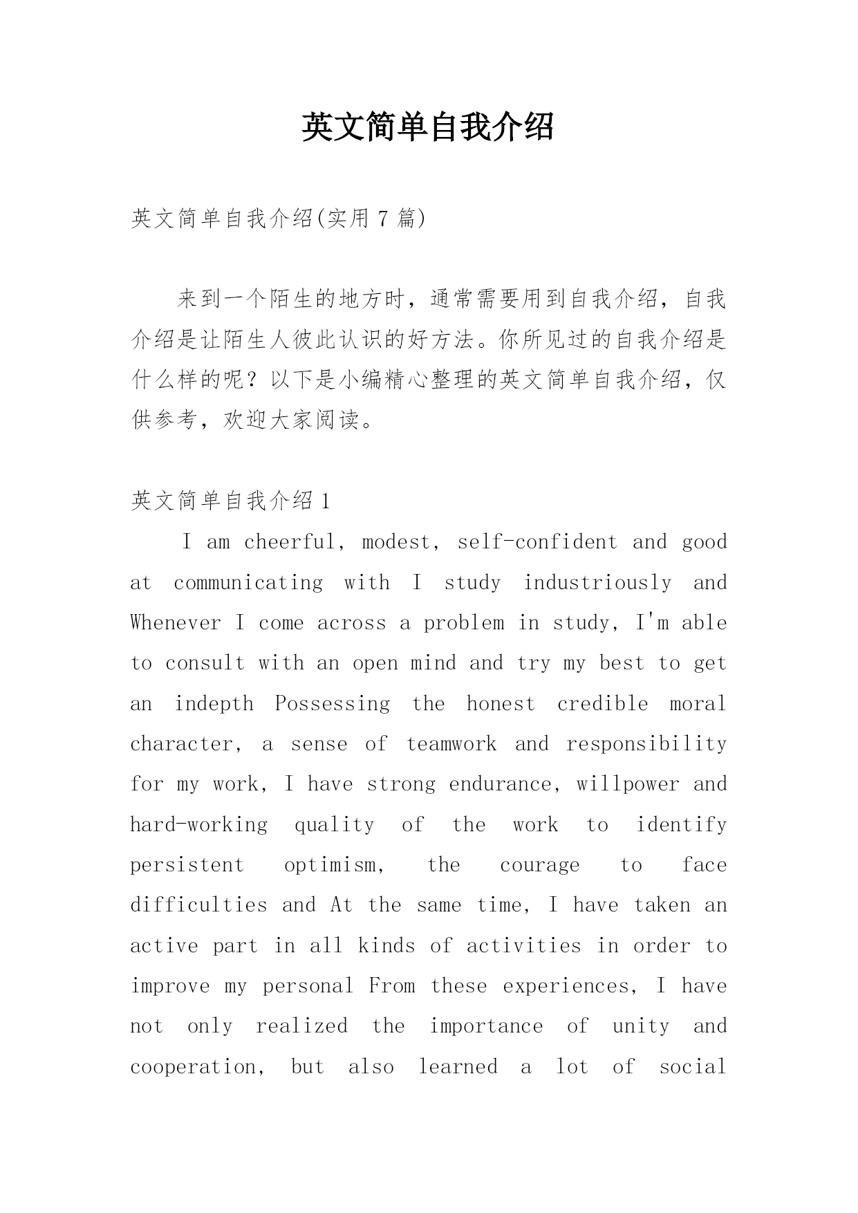 英文简单自我介绍英文简单自我介绍(实用7篇)来到一个陌生的地方时,通常需要用到自我介绍,自我介绍是让陌生人彼此认识的好方法。你所见过的自我介绍是什么样的呢?以下是小编精心整理的英文简单自我介绍,仅供参考,欢迎大家阅读。英文简单自我介绍1Iamcheerful,modest,self-confidentandgoodatcommunicatingwithIstudyindustriouslyandWheneverIcomeacrossaprobleminstudy,I'mabletoconsultwitha
