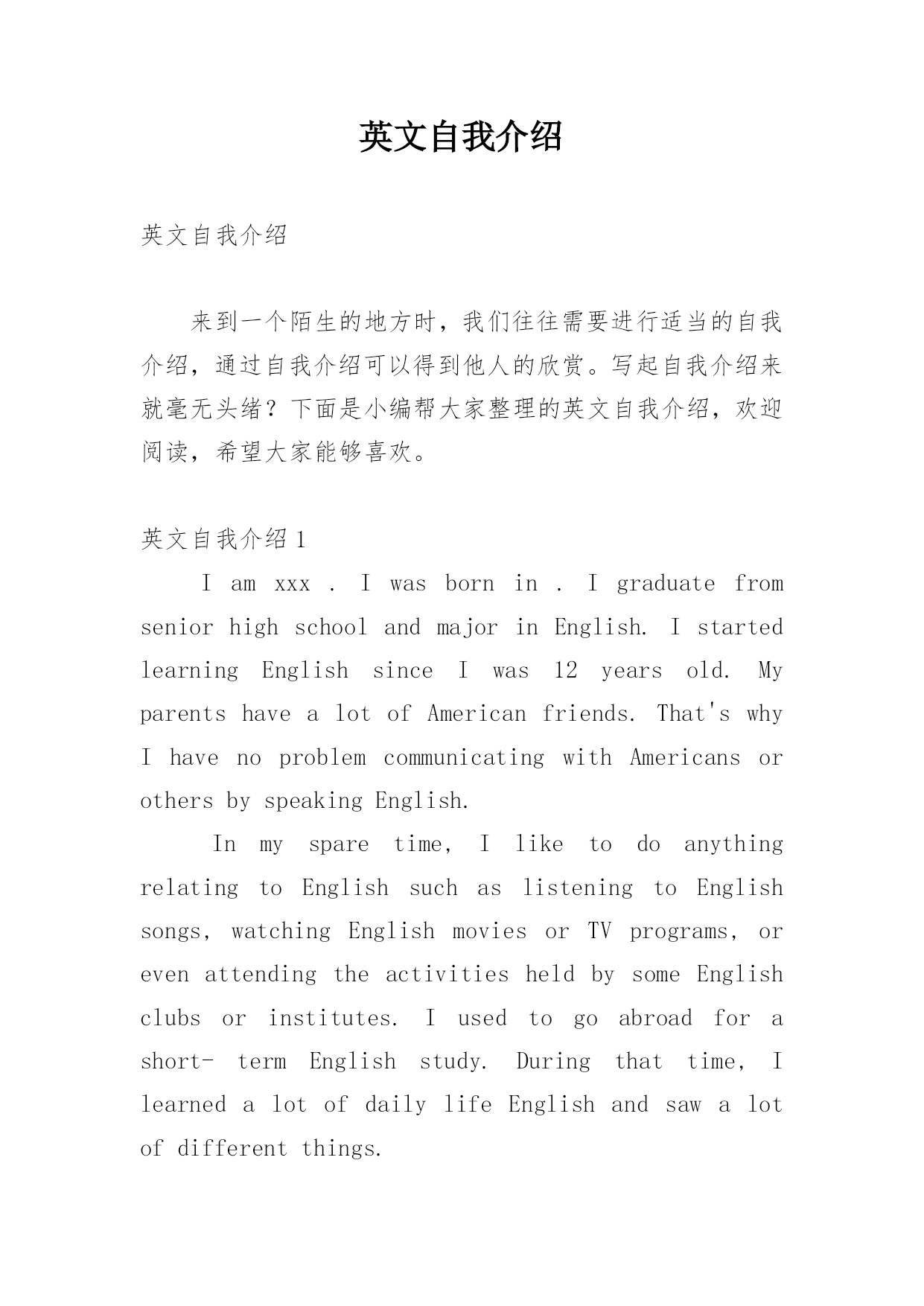 英文自我介绍英文自我介绍来到一个陌生的地方时,我们往往需要进行适当的自我介绍,通过自我介绍可以得到他人的欣赏。写起自我介绍来就毫无头绪?下面是小编帮大家整理的英文自我介绍,欢迎阅读,希望大家能够喜欢。英文自我介绍1Iamxxx.Iwasbornin.IgraduatefromseniorhighschoolandmajorinEnglish.IstartedlearningEnglishsinceIwas12yearsold.MyparentshavealotofAmericanfriends.That'