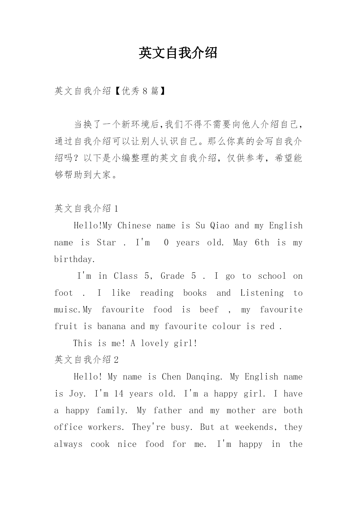 英文自我介绍英文自我介绍【优秀8篇】当换了一个新环境后,我们不得不需要向他人介绍自己,通过自我介绍可以让别人认识自己。那么你真的会写自我介绍吗?以下是小编整理的英文自我介绍,仅供参考,希望能够帮助到大家。英文自我介绍1Hello!MyChinesenameisSuQiaoandmyEnglishnameisStar.I'm0yearsold.May6thismybirthday.I'minClass5,Grade5.Igotoschoolonfoot.IlikereadingbooksandListeni
