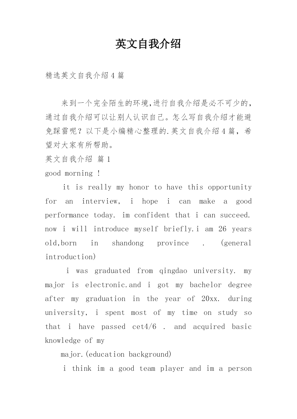 英文自我介绍精选英文自我介绍4篇来到一个完全陌生的环境,进行自我介绍是必不可少的,通过自我介绍可以让别人认识自己。怎么写自我介绍才能避免踩雷呢?以下是小编精心整理的.英文自我介绍4篇,希望对大家有所帮助。英文自我介绍篇1goodmorning!itisreallymyhonortohavethisopportunityforaninterview,ihopeicanmakeagoodperformancetoday.imconfidentthaticansucceed.nowiwillintroducem