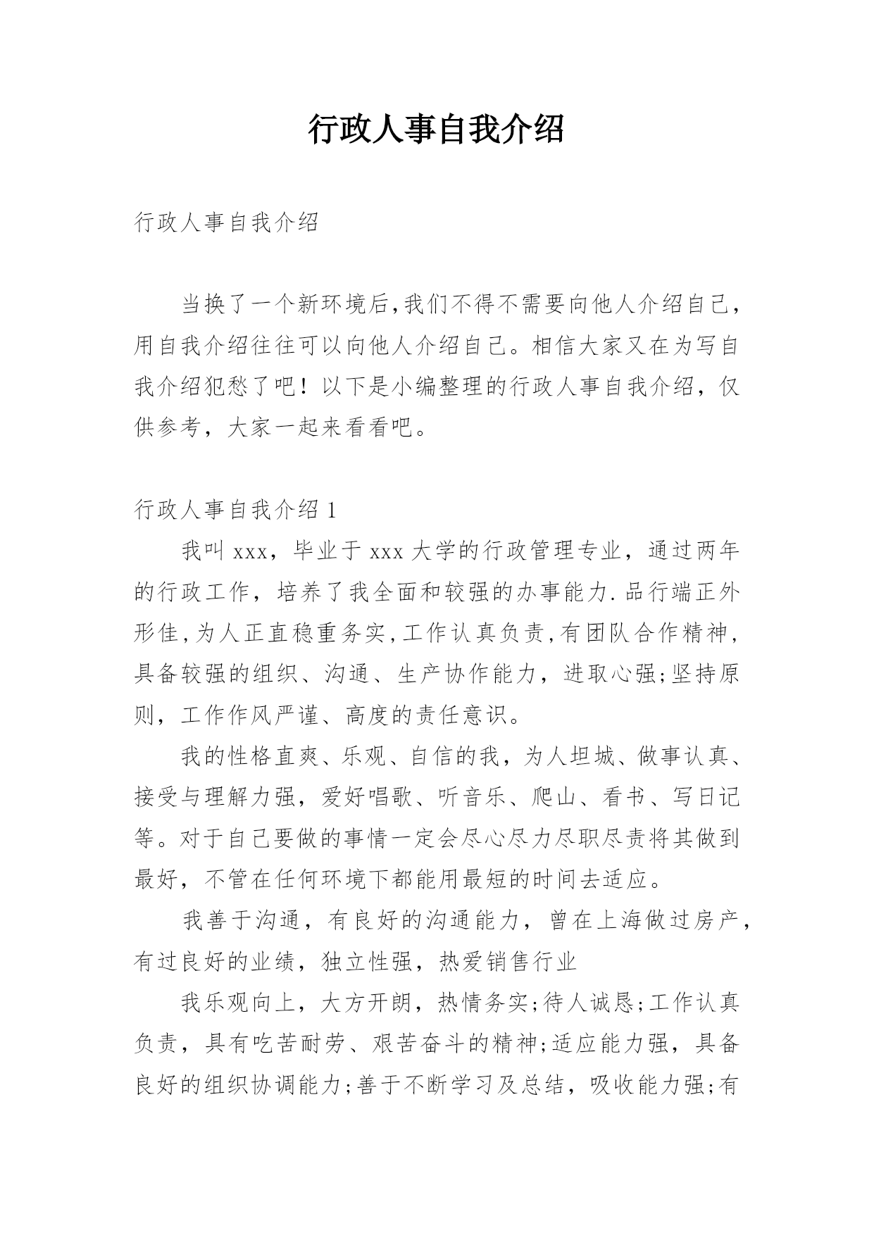行政人事自我介绍行政人事自我介绍当换了一个新环境后,我们不得不需要向他人介绍自己,用自我介绍往往可以向他人介绍自己。相信大家又在为写自我介绍犯愁了吧!以下是小编整理的行政人事自我介绍,仅供参考,大家一起来看看吧。行政人事自我介绍1我叫xxx,毕业于xxx大学的行政管理专业,通过两年的行政工作,培养了我全面和较强的办事能力.品行端正外形佳,为人正直稳重务实,工作认真负责,有团队合作精神,具备较强的组织、沟通、生产协作能力,进取心强;坚持原则,工作作风严谨、高度的责任意识。我的性格直爽、乐观、自信的我,为人坦