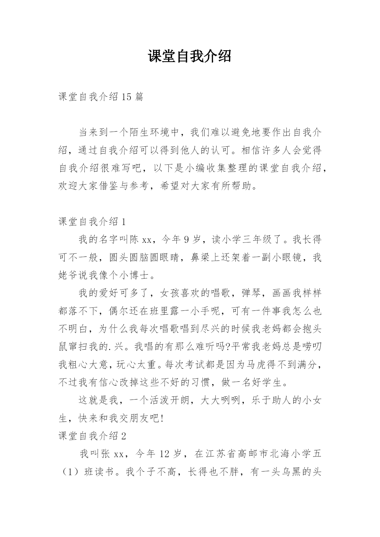 课堂自我介绍课堂自我介绍15篇当来到一个陌生环境中,我们难以避免地要作出自我介绍,通过自我介绍可以得到他人的认可。相信许多人会觉得自我介绍很难写吧,以下是小编收集整理的课堂自我介绍,欢迎大家借鉴与参考,希望对大家有所帮助。课堂自我介绍1我的名字叫陈xx,今年9岁,读小学三年级了。我长得可不一般,圆头圆脑圆眼睛,鼻梁上还架着一副小眼镜,我姥爷说我像个小博士。我的爱好可多了,女孩喜欢的唱歌,弹琴,画画我样样都落不下,偶尔还在班里露一小手呢,可有一件事我怎么也不明白,为什么我每次唱歌唱到尽兴的时候我老妈都会抱头