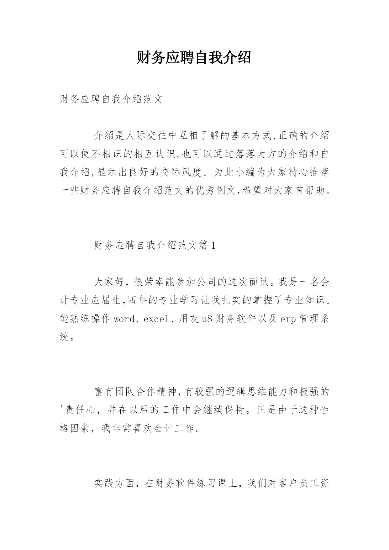 财务应聘自我介绍财务应聘自我介绍范文介绍是人际交往中互相了解的基本方式,正确的介绍可以使不相识的相互认识,也可以通过落落大方的介绍和自我介绍,显示出良好的交际风度。为此小编为大家精心推荐一些财务应聘自我介绍范文的优秀例文,希望对大家有帮助。财务应聘自我介绍范文篇1大家好,很荣幸能参加公司的这次面试。我是一名会计专业应届生,四年的专业学习让我扎实的掌握了专业知识。能熟练操作word、excel、用友u8财务软件以及erp管理系统。富有团队合作精神,有较强的逻辑思维能力和极强的'责任心,并在以后的工作中会继续