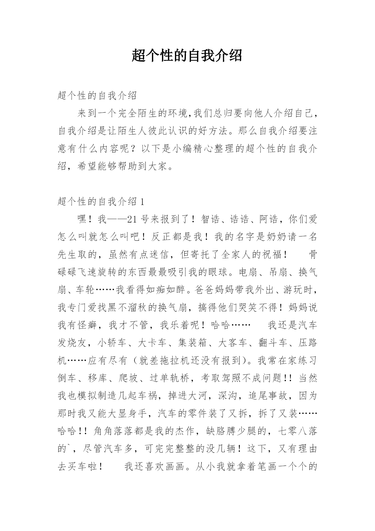 超个性的自我介绍超个性的自我介绍来到一个完全陌生的环境,我们总归要向他人介绍自己,自我介绍是让陌生人彼此认识的好方法。那么自我介绍要注意有什么内容呢?以下是小编精心整理的超个性的自我介绍,希望能够帮助到大家。超个性的自我介绍1嘿!我——21号来报到了!智诰、诰诰、阿诰,你们爱怎么叫就怎么叫吧!反正都是我!我的名字是奶奶请一名先生取的,虽然有点迷信,但寄托了全家人的祝福!骨碌碌飞速旋转的东西最最吸引我的眼球。电扇、吊扇、换气扇、车轮……我看得如痴如醉。爸爸妈妈带我外出、游玩时,我专门爱找黑不溜秋的换气扇,搞