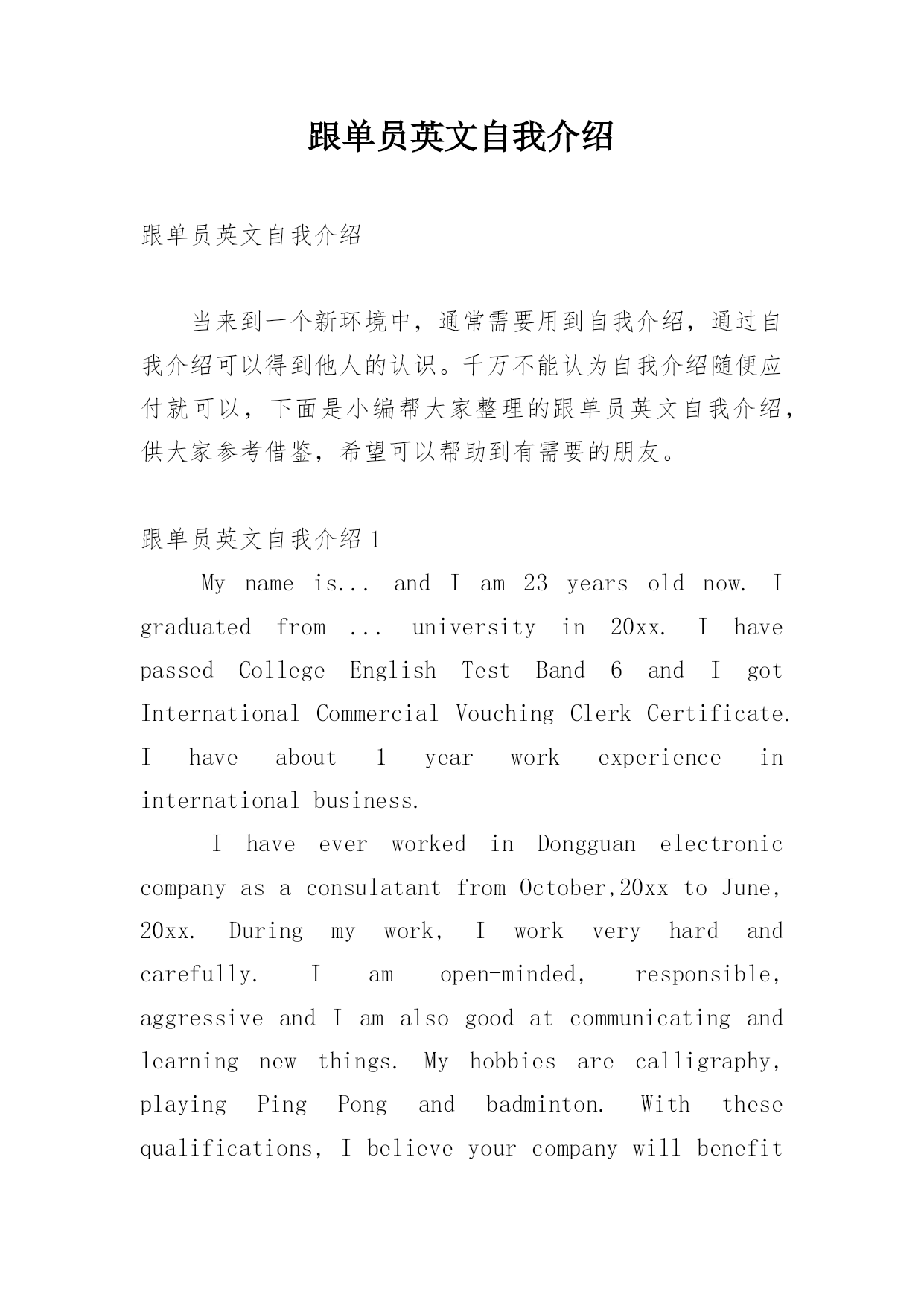 跟单员英文自我介绍跟单员英文自我介绍当来到一个新环境中,通常需要用到自我介绍,通过自我介绍可以得到他人的认识。千万不能认为自我介绍随便应付就可以,下面是小编帮大家整理的跟单员英文自我介绍,供大家参考借鉴,希望可以帮助到有需要的朋友。跟单员英文自我介绍1Mynameis...andIam23yearsoldnow.Igraduatedfrom...universityin20xx.IhavepassedCollegeEnglishTestBand6andIgotInternationalCommercial