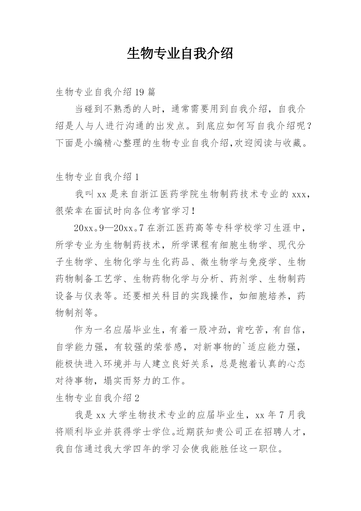 生物专业自我介绍生物专业自我介绍19篇当碰到不熟悉的人时,通常需要用到自我介绍,自我介绍是人与人进行沟通的出发点。到底应如何写自我介绍呢?下面是小编精心整理的生物专业自我介绍,欢迎阅读与收藏。生物专业自我介绍1我叫xx是来自浙江医药学院生物制药技术专业的xxx,很荣幸在面试时向各位考官学习!20xx。9—20xx。7在浙江医药高等专科学校学习生涯中,所学专业为生物制药技术,所学课程有细胞生物学、现代分子生物学、生物化学与生化药品、微生物学与免疫学、生物药物制备工艺学、生物药物化学与分析、药剂学、生物制药设
