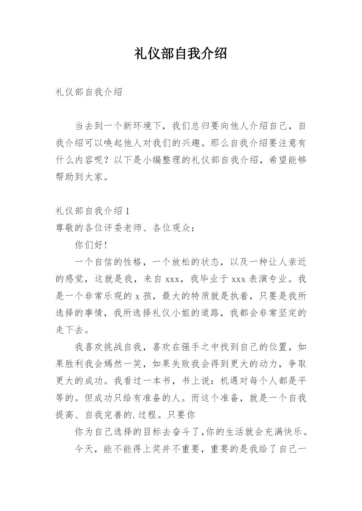 礼仪部自我介绍礼仪部自我介绍当去到一个新环境下,我们总归要向他人介绍自己,自我介绍可以唤起他人对我们的兴趣。那么自我介绍要注意有什么内容呢?以下是小编整理的礼仪部自我介绍,希望能够帮助到大家。礼仪部自我介绍1尊敬的各位评委老师、各位观众:你们好!一个自信的性格,一个放松的状态,以及一种让人亲近的感觉,这就是我,来自xxx,我毕业于xxx表演专业。我是一个非常乐观的x孩,最大的特质就是执着,只要是我所选择的事情,我所选择礼仪小姐的道路,我都会非常坚定的走下去。我喜欢挑战自我,喜欢在强手之中找到自己的位置,如