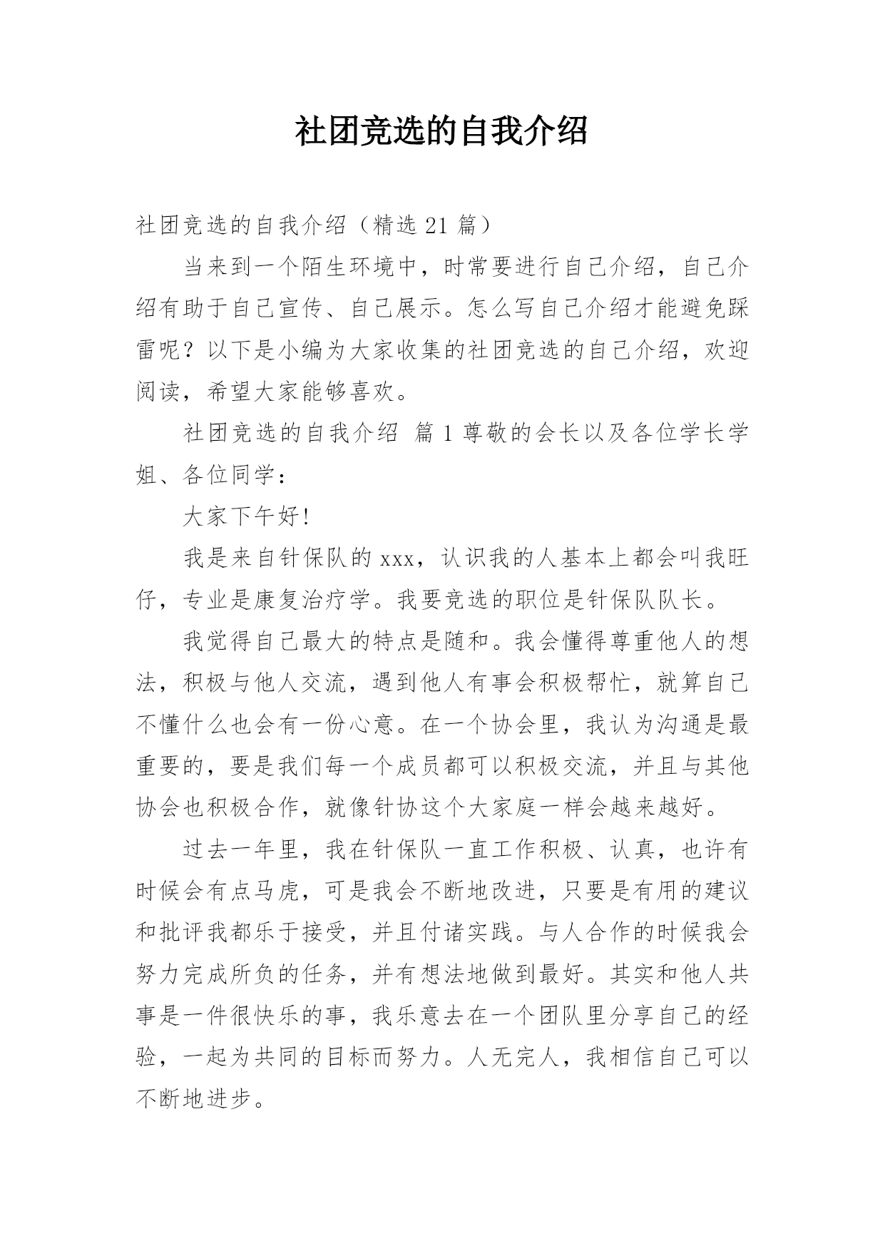 社团竞选的自我介绍社团竞选的自我介绍(精选21篇)当来到一个陌生环境中,时常要进行自己介绍,自己介绍有助于自己宣传、自己展示。怎么写自己介绍才能避免踩雷呢?以下是小编为大家收集的社团竞选的自己介绍,欢迎阅读,希望大家能够喜欢。社团竞选的自我介绍篇1尊敬的会长以及各位学长学姐、各位同学:大家下午好!我是来自针保队的xxx,认识我的人基本上都会叫我旺仔,专业是康复治疗学。我要竞选的职位是针保队队长。我觉得自己最大的特点是随和。我会懂得尊重他人的想法,积极与他人交流,遇到他人有事会积极帮忙,就算自己不懂什么也会
